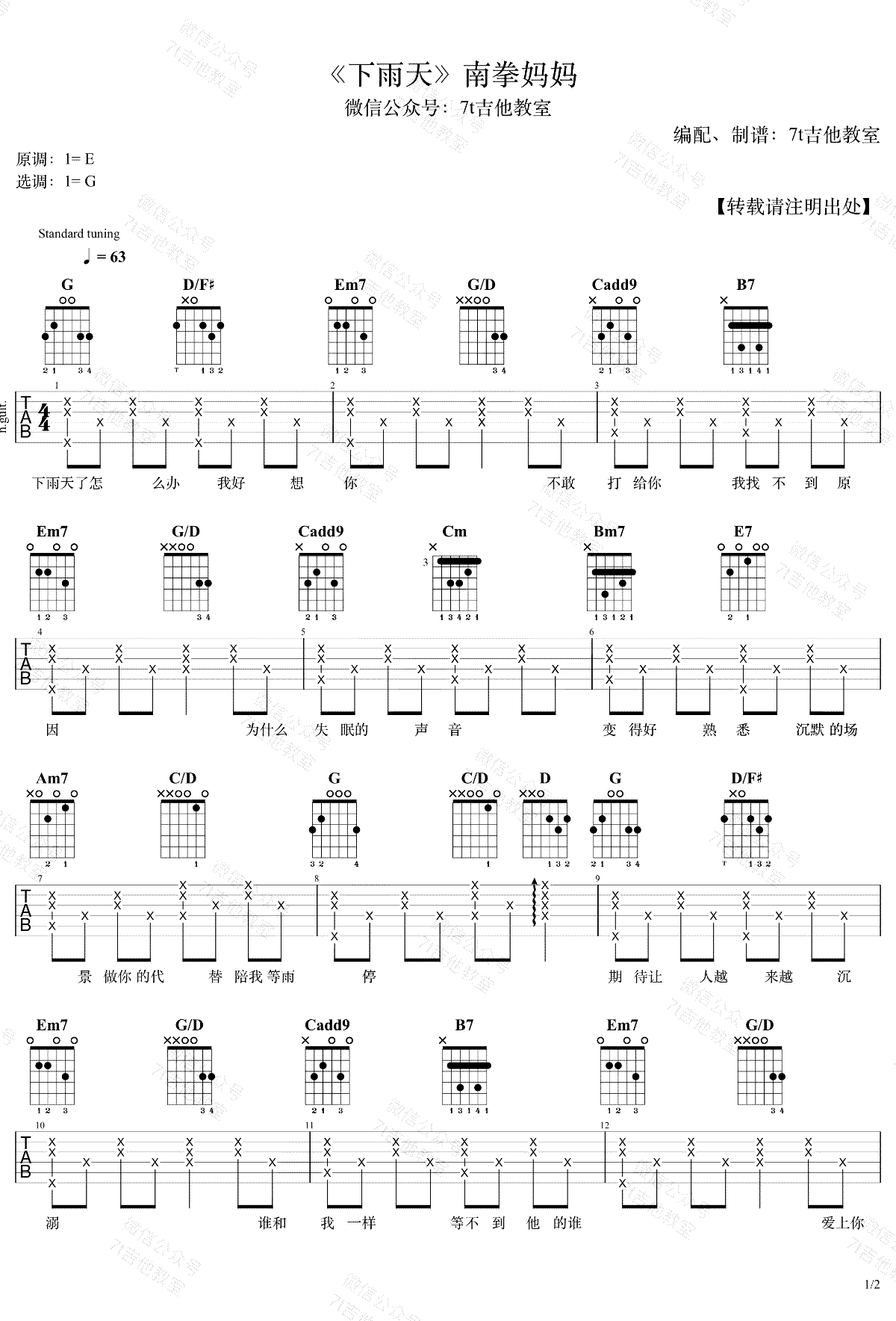 《南拳妈妈《下雨天吉他谱》(G调)》内容来自于互联网,不能保证内容的准确性与完整性,仅供学习交流欣赏,请勿用于其它用途,内容版权归原作者及来源网站所有,如有侵犯到您的权益请来信告知,我们将及时删除。