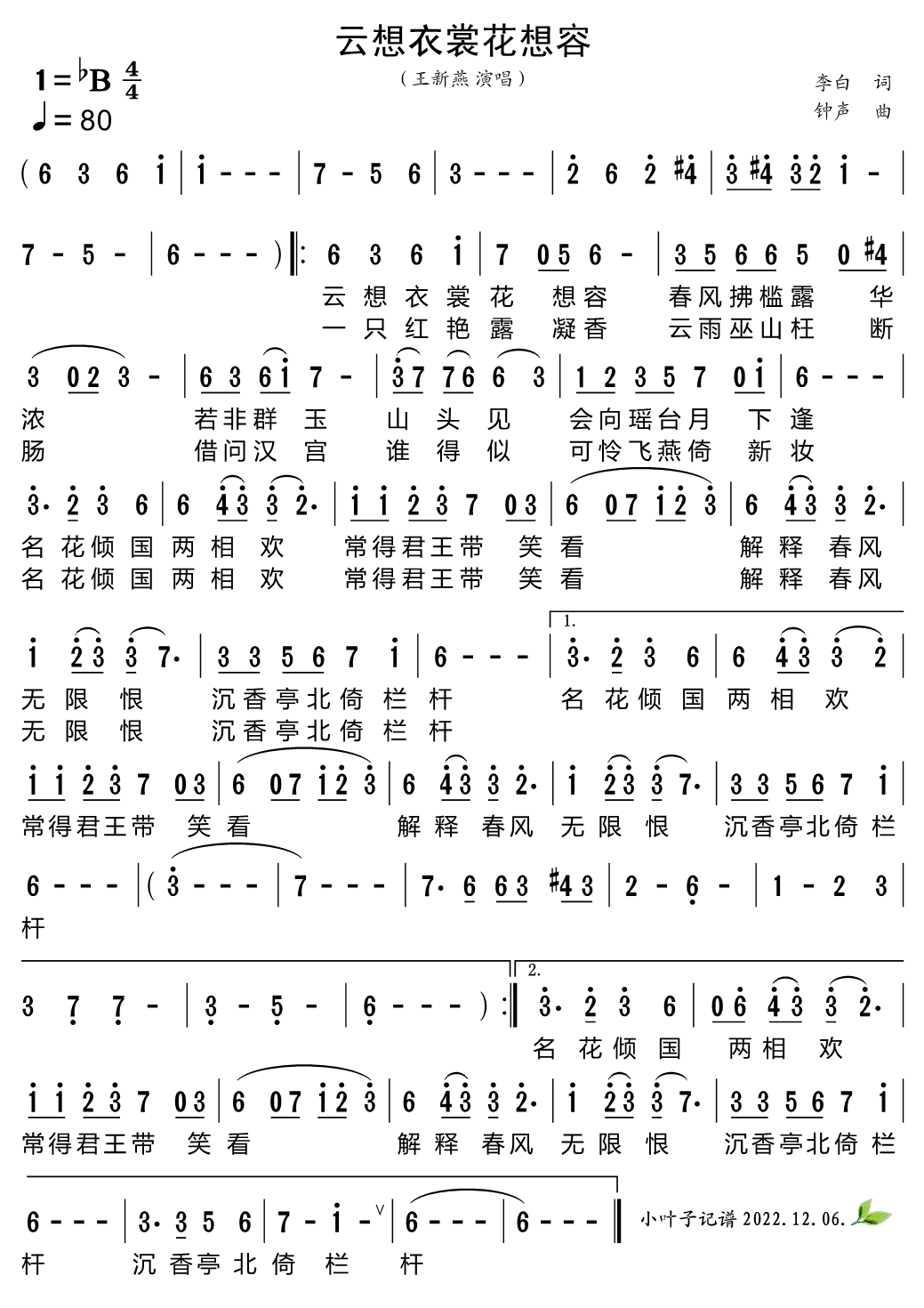 《王新燕《云想衣裳花想容简谱》》内容来自于互联网,不能保证内容的准确性与完整性,仅供学习交流欣赏,请勿用于其它用途,内容版权归原作者及来源网站所有,如有侵犯到您的权益请来信告知,我们将及时删除。
