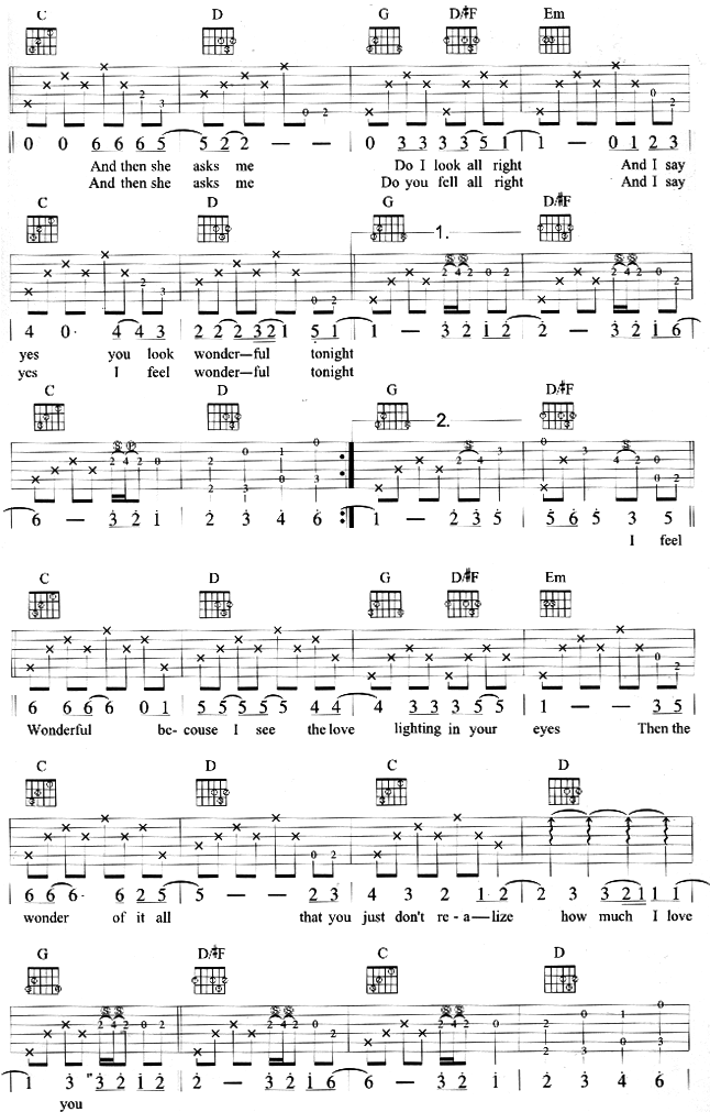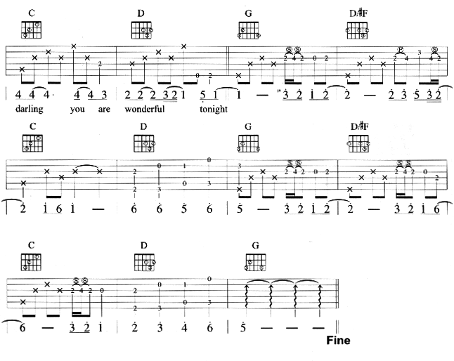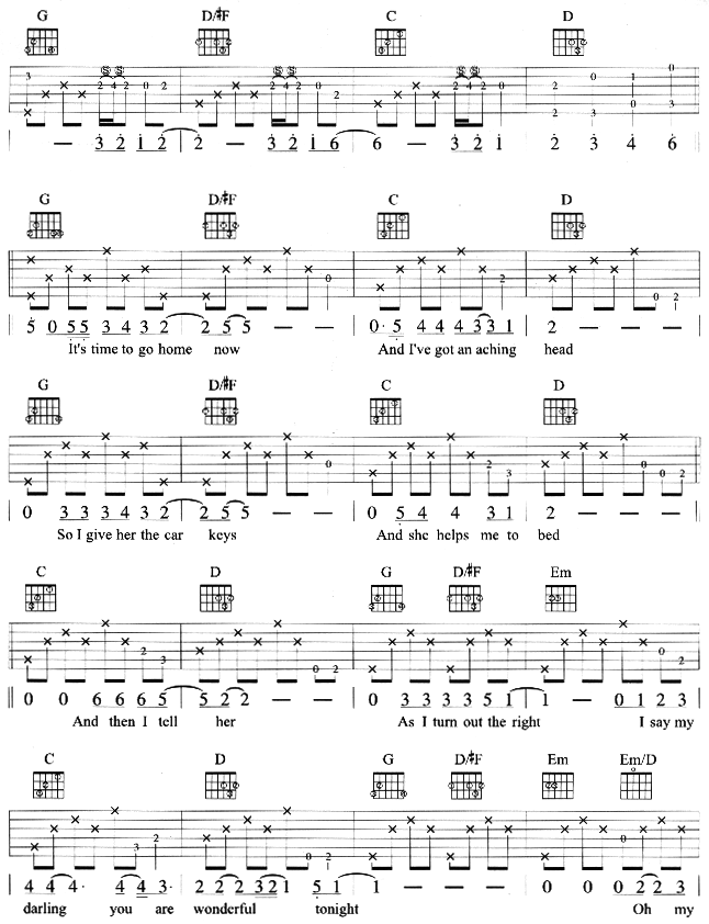 《《wonderful tonight吉他谱》》内容来自于互联网,不能保证内容的准确性与完整性,仅供学习交流欣赏,请勿用于其它用途,内容版权归原作者及来源网站所有,如有侵犯到您的权益请来信告知,我们将及时删除。