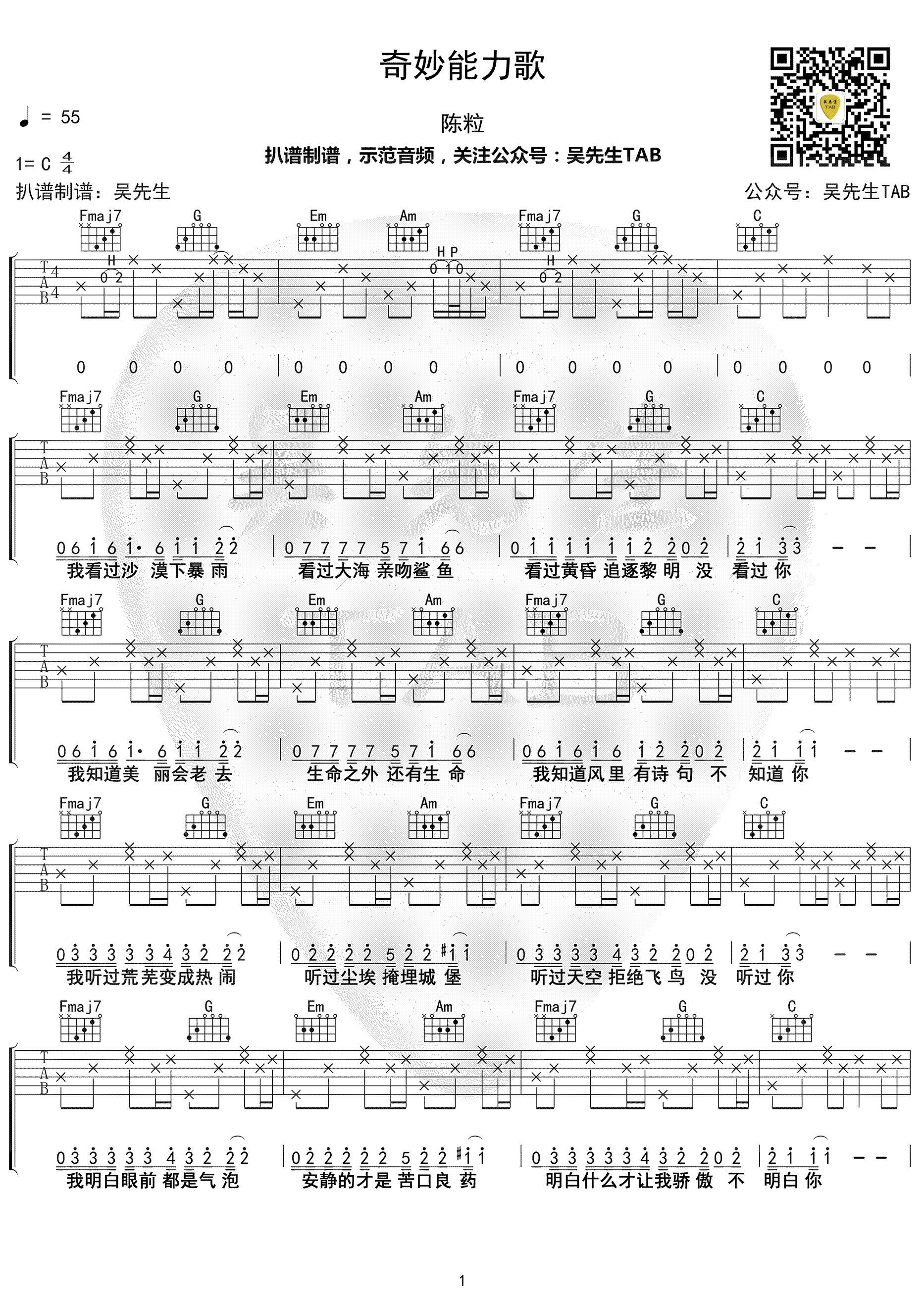 《奇妙能力歌》吉他谱,陈粒演唱,是一首清新充满忧伤情感的民谣代表作。歌曲以轻快自由的曲调和灵动自然的歌声为特点,吉他琴音的伴奏带领着人们感受生活的点滴,将我们引入如诗如幻的美丽画面。这首歌的谱曲以C调六线谱为基础,由吴先生编排分享,高清弹唱图片谱在91吉他谱平
