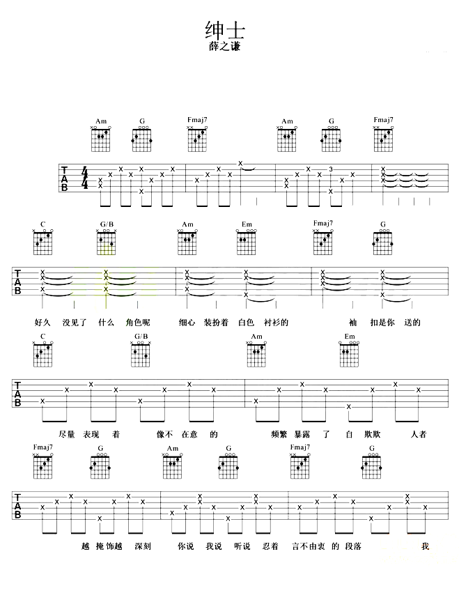 《薛之谦《绅士吉他谱》》内容来自于互联网,不能保证内容的准确性与完整性,仅供学习交流欣赏,请勿用于其它用途,内容版权归原作者及来源网站所有,如有侵犯到您的权益请来信告知,我们将及时删除。