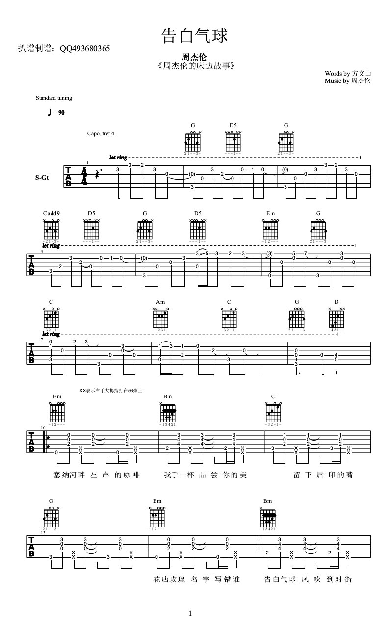 《告白气球》吉他谱高清版,附带Capo夹,适合第四品位。这是周杰伦的新歌,一首非常动听的表白歌曲,充满了浪漫和甜蜜的氛围。它被收录在专辑《周杰伦的床前故事》中,特别感谢SlimBoogie提供的编曲谱。在这个版本中,我们将前奏和间奏改成了指弹的方式演奏,希望这