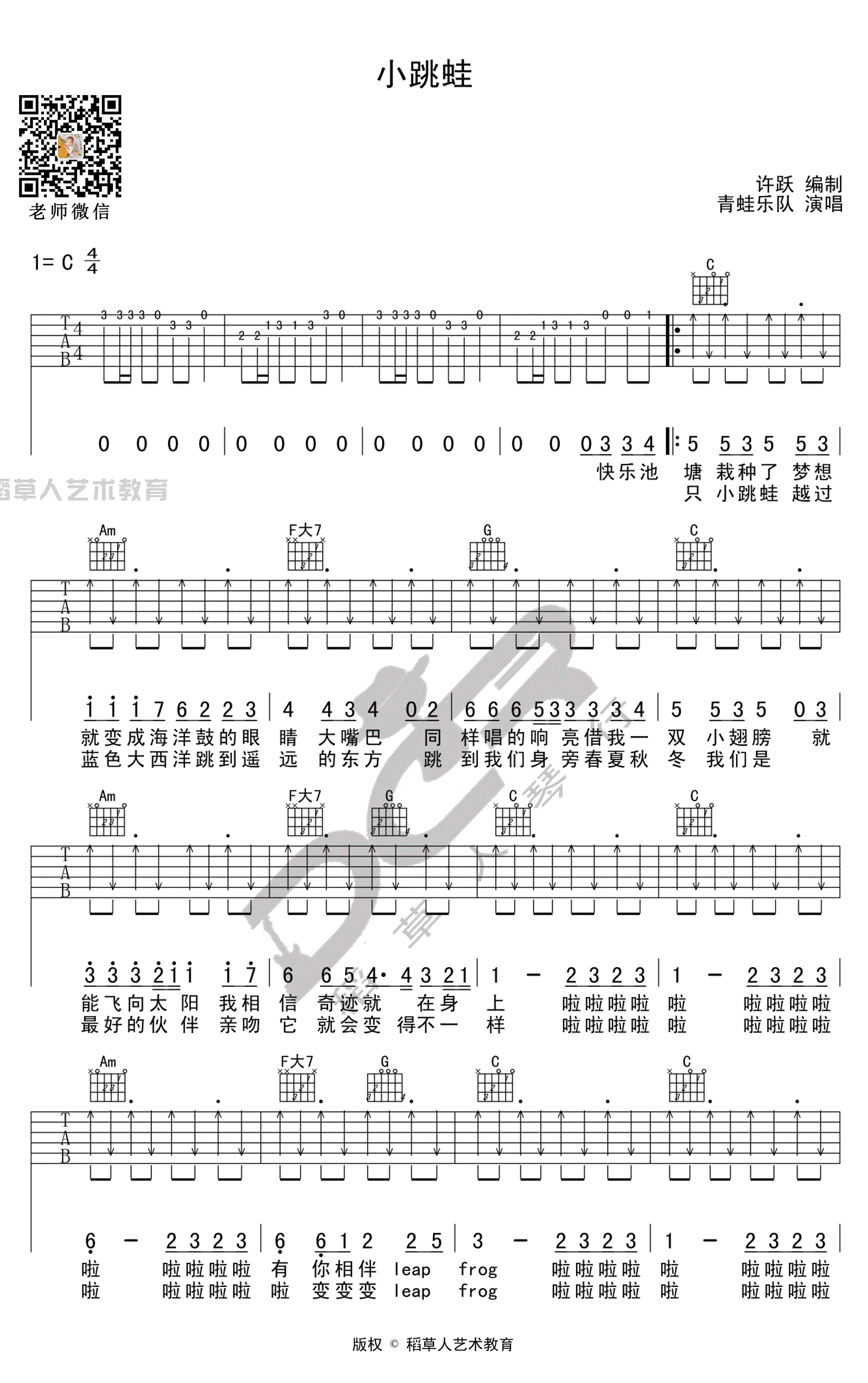 《青蛙乐队《小跳蛙吉他谱》》内容来自于互联网,不能保证内容的准确性与完整性,仅供学习交流欣赏,请勿用于其它用途,内容版权归原作者及来源网站所有,如有侵犯到您的权益请来信告知,我们将及时删除。
