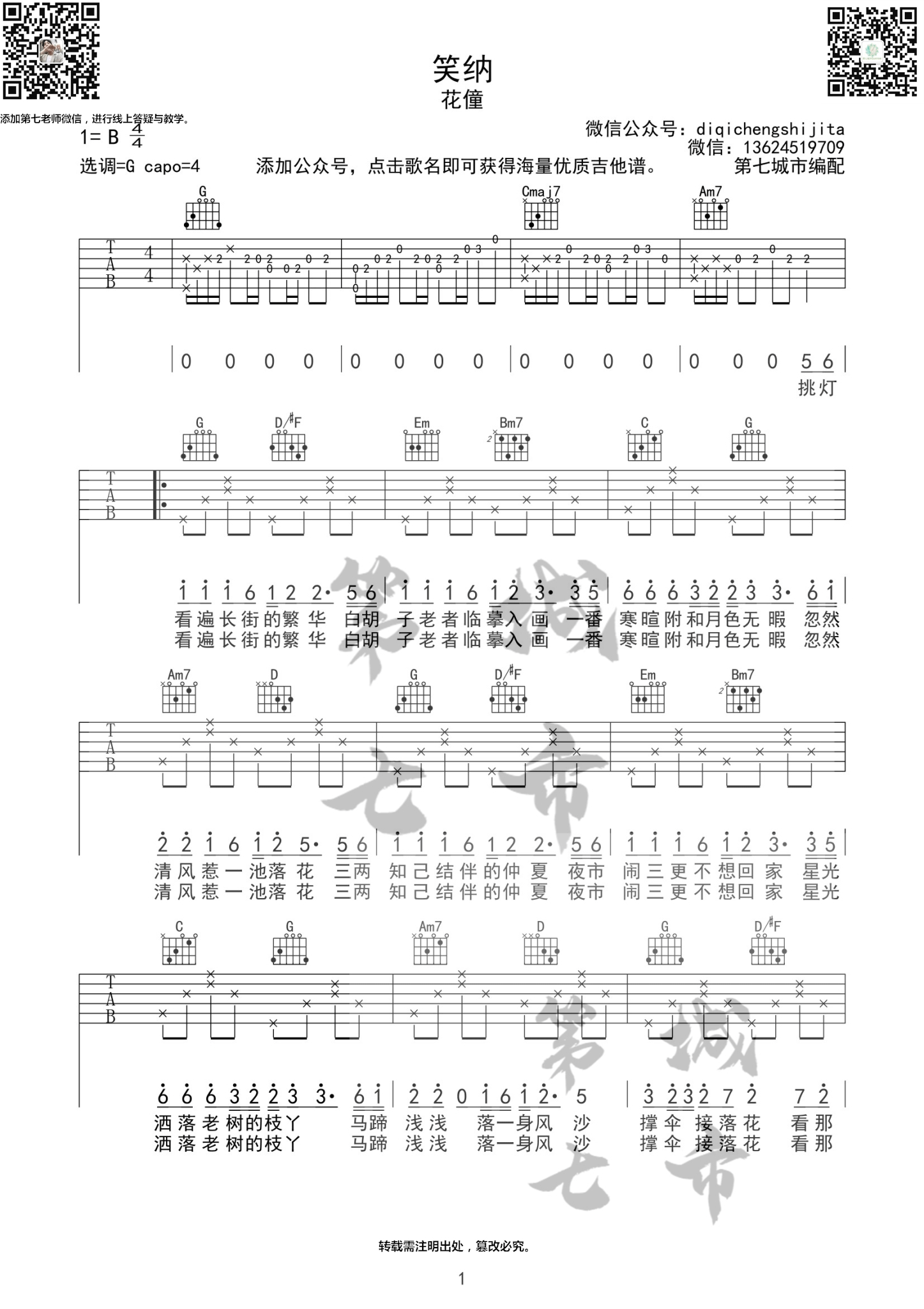 《花僮《笑纳吉他谱》(G调)》内容来自于互联网,不能保证内容的准确性与完整性,仅供学习交流欣赏,请勿用于其它用途,内容版权归原作者及来源网站所有,如有侵犯到您的权益请来信告知,我们将及时删除。
