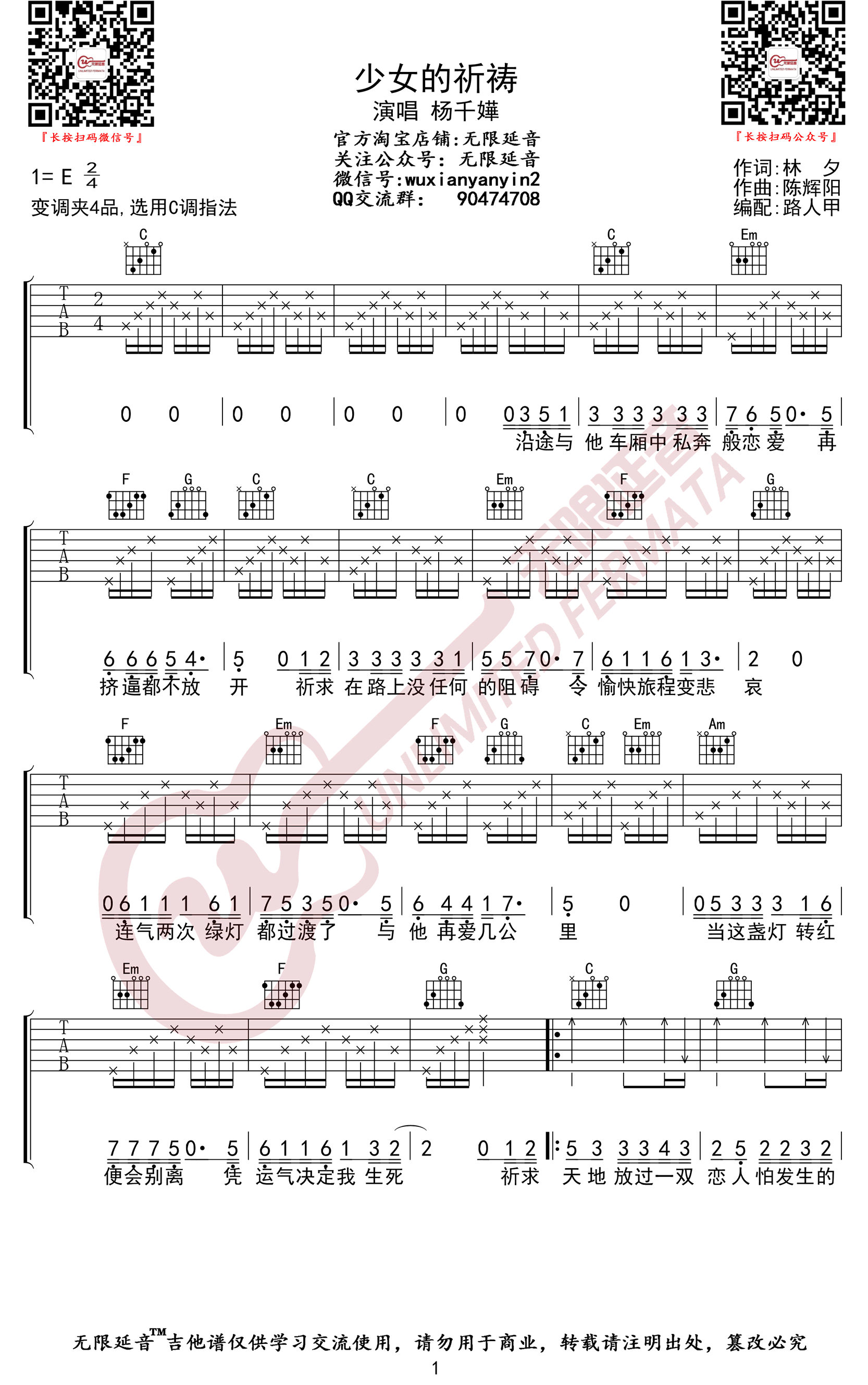 《杨千嬅《少女的祈祷吉他谱》》内容来自于互联网,不能保证内容的准确性与完整性,仅供学习交流欣赏,请勿用于其它用途,内容版权归原作者及来源网站所有,如有侵犯到您的权益请来信告知,我们将及时删除。