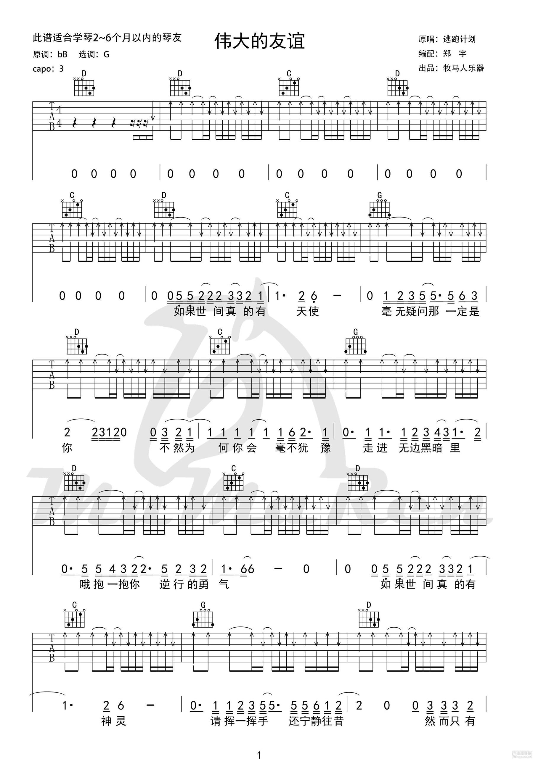 《伟大的友谊》是逃跑计划的一首歌曲,该曲谱适合吉他初学者使用,不需要复杂的按法,易学易弹。这份谱子采用原调bB,也可以选用G调,使用CAPO夹在第三品。曲谱由牧马人乐器编配,共有四张高清图片谱,确保学习者能够清晰地看到每个音符和指法。无论你是新手还是有一定吉他
