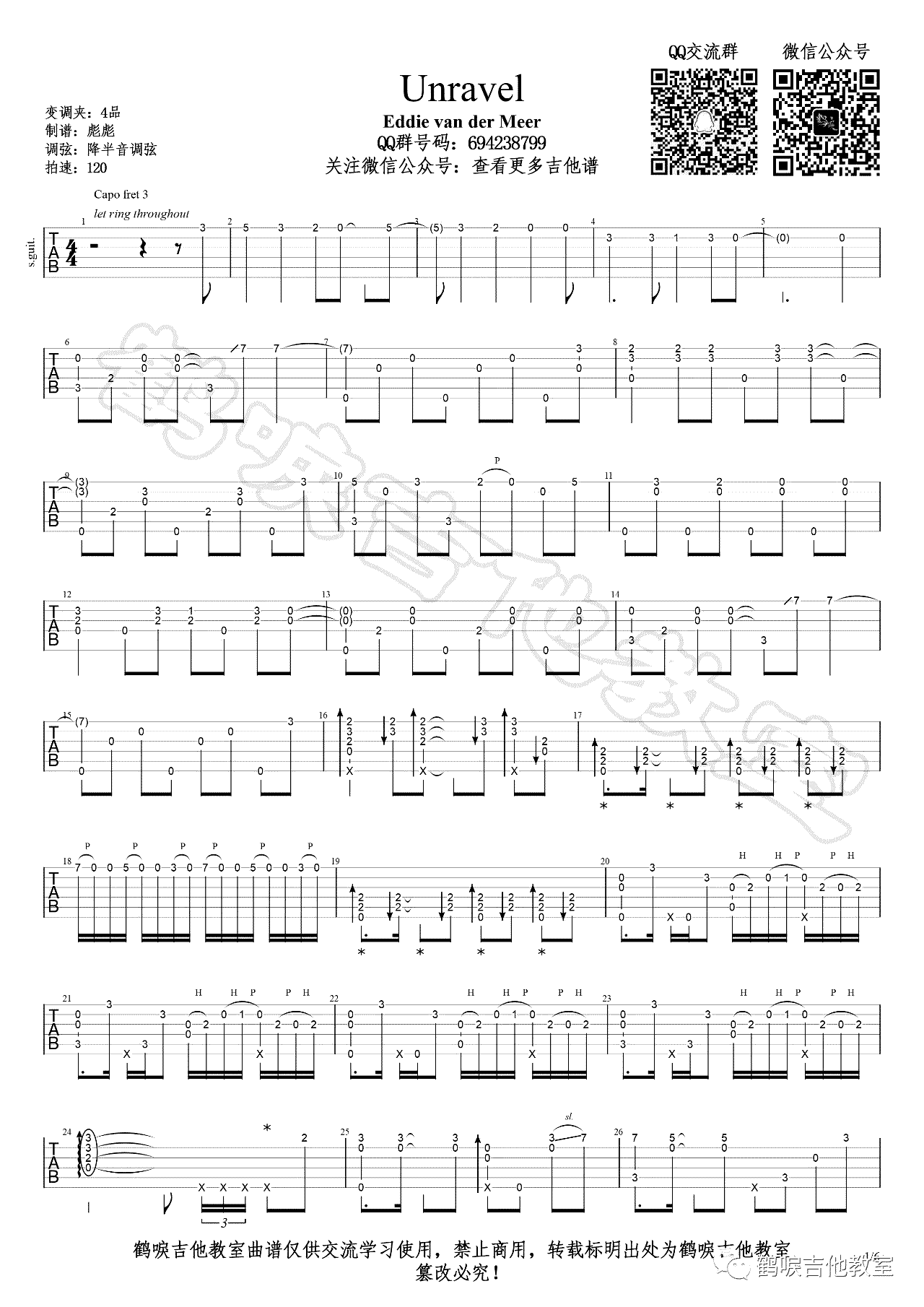 这首吉他独奏曲谱是Eddie van der Meer版本改编的《Unravel》,是动画《东京食尸鬼》的主题曲。谱中使用了变调夹夹四品和降半音调弦。共六张图片谱例,由鹤鸣吉他教室编排上传。这首曲子曾获得日本最佳动画主题曲奖,它的旋律在宁静之后变得高昂,仿佛是