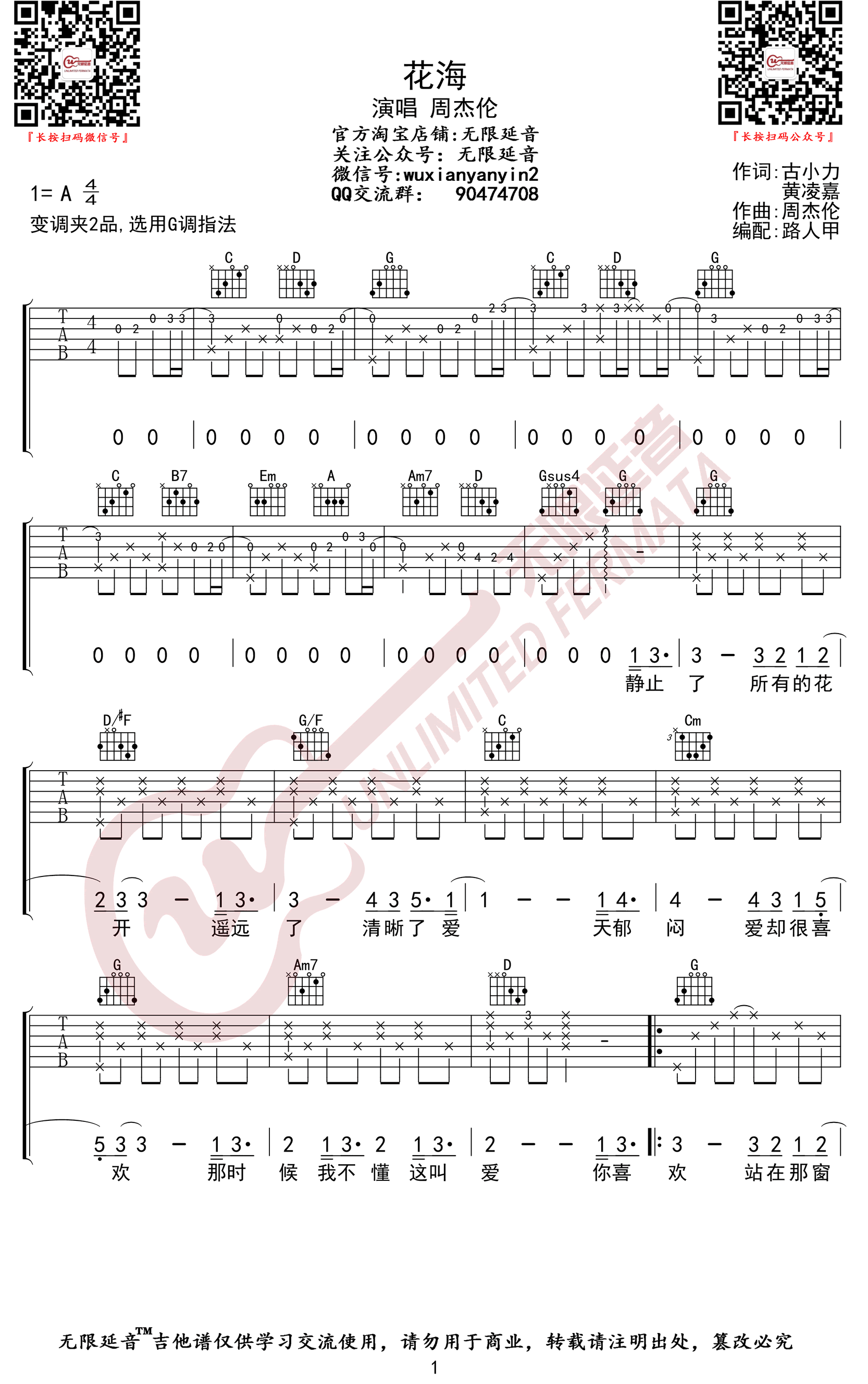 《周杰伦《花海吉他谱》》内容来自于互联网,不能保证内容的准确性与完整性,仅供学习交流欣赏,请勿用于其它用途,内容版权归原作者及来源网站所有,如有侵犯到您的权益请来信告知,我们将及时删除。