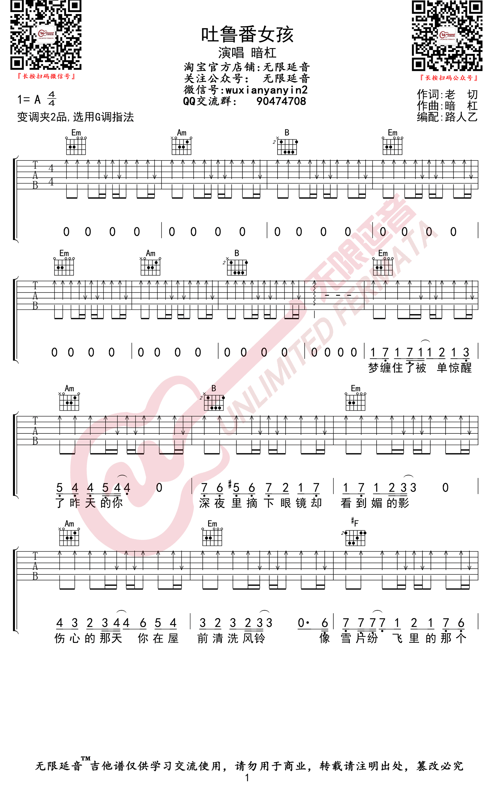 《暗杠《吐鲁番女孩吉他谱》》内容来自于互联网,不能保证内容的准确性与完整性,仅供学习交流欣赏,请勿用于其它用途,内容版权归原作者及来源网站所有,如有侵犯到您的权益请来信告知,我们将及时删除。