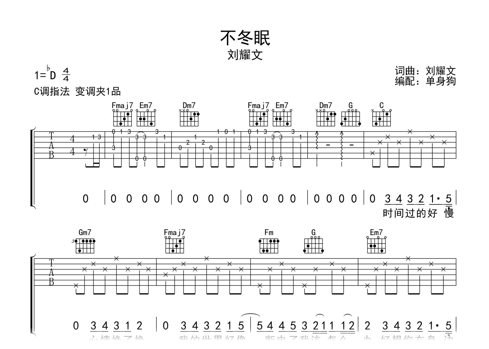 《刘耀文《不冬眠吉他谱》(C调)》内容来自于互联网,不能保证内容的准确性与完整性,仅供学习交流欣赏,请勿用于其它用途,内容版权归原作者及来源网站所有,如有侵犯到您的权益请来信告知,我们将及时删除。