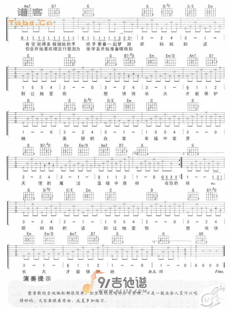 《周杰伦《听妈妈的话吉他谱》(G调)》内容来自于互联网,不能保证内容的准确性与完整性,仅供学习交流欣赏,请勿用于其它用途,内容版权归原作者及来源网站所有,如有侵犯到您的权益请来信告知,我们将及时删除。