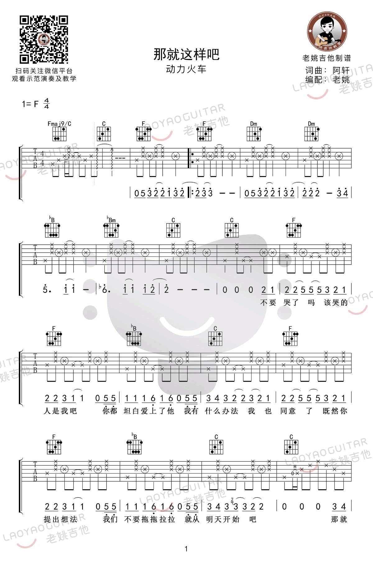 这是一首动力火车演唱的经典情歌《那就这样吧》的吉他谱,采用F调和弦拍弦版本,共有三张图片。由吉他编配专家老姚制作,提供吉他弹唱教学,适合吉他爱好者学习。这首歌曲是吉他撩妹的必学之选,琴友们可以跟随老姚老师的示范讲解练习,掌握这首动情的旋律。