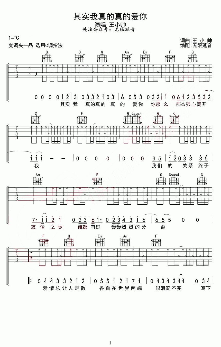 《王小帅《其实我真的真的爱你吉他谱》(C调)》内容来自于互联网,不能保证内容的准确性与完整性,仅供学习交流欣赏,请勿用于其它用途,内容版权归原作者及来源网站所有,如有侵犯到您的权益请来信告知,我们将及时删除。