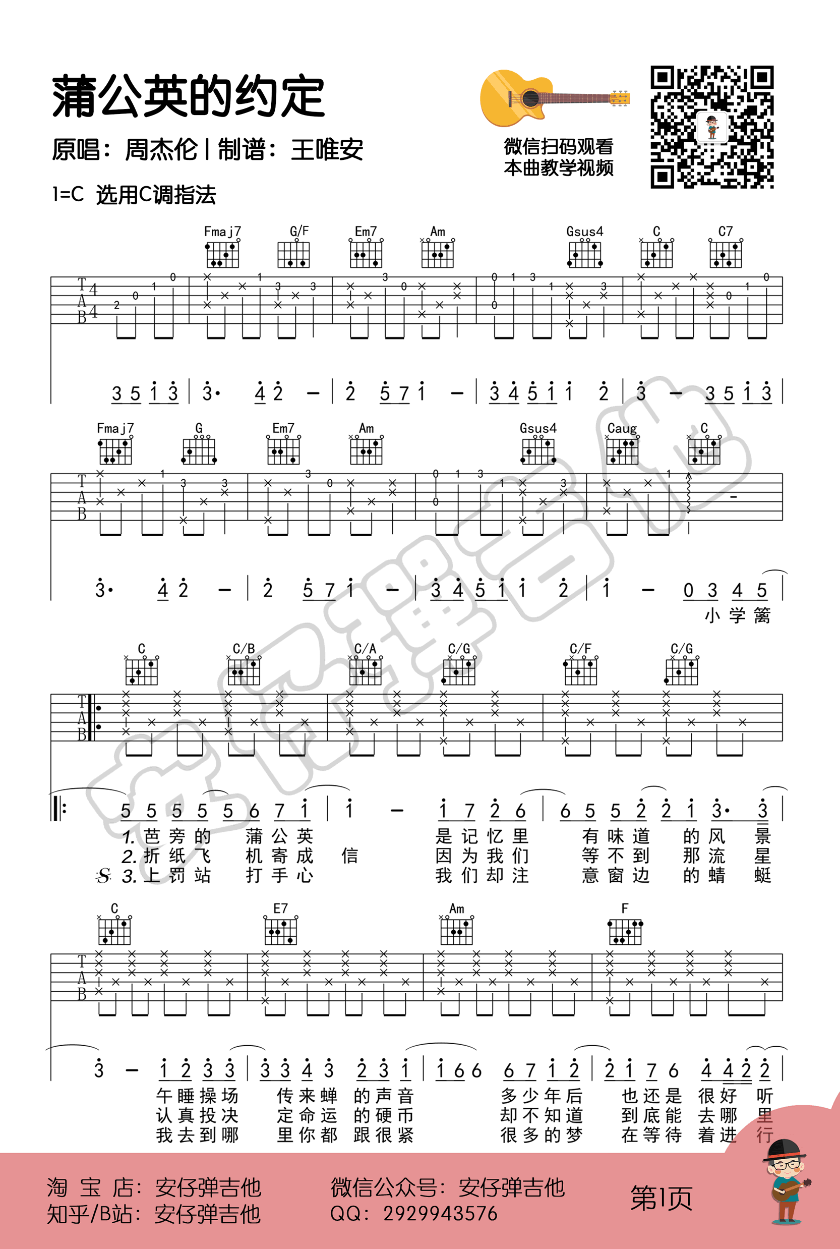 这是一首周杰伦演唱的经典代表歌曲《蒲公英的约定》的吉他谱,采用C调六线谱,附带三张高清谱图。由安仔精心编排,同时提供吉他弹唱和教学视频。和声分析显示,主歌采用传统的低音下行进行,以优美的176543251和弦结束,类似于林俊杰的《记得》。而副歌的和声进行为45