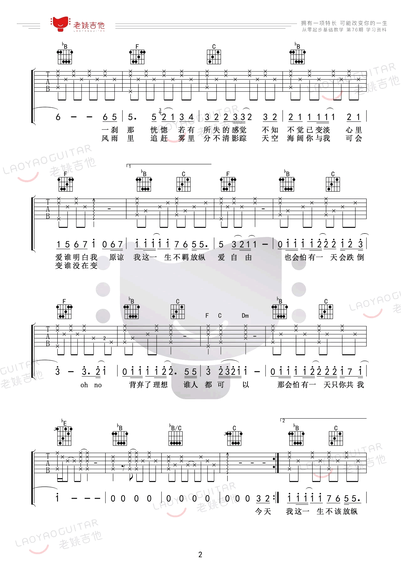 Beyond的经典粤语歌曲《海阔天空》吉他谱,由老姚吉他呈现。这份谱子采用六线谱,高度还原原曲,内容包括五张图片谱。教学内容涵盖F调练习和六度音程等知识点,为学习者提供全面指导。此外,教程还附带《海阔天空》吉他弹唱教学视频,学习者可通过观看老师的示范讲解,更好