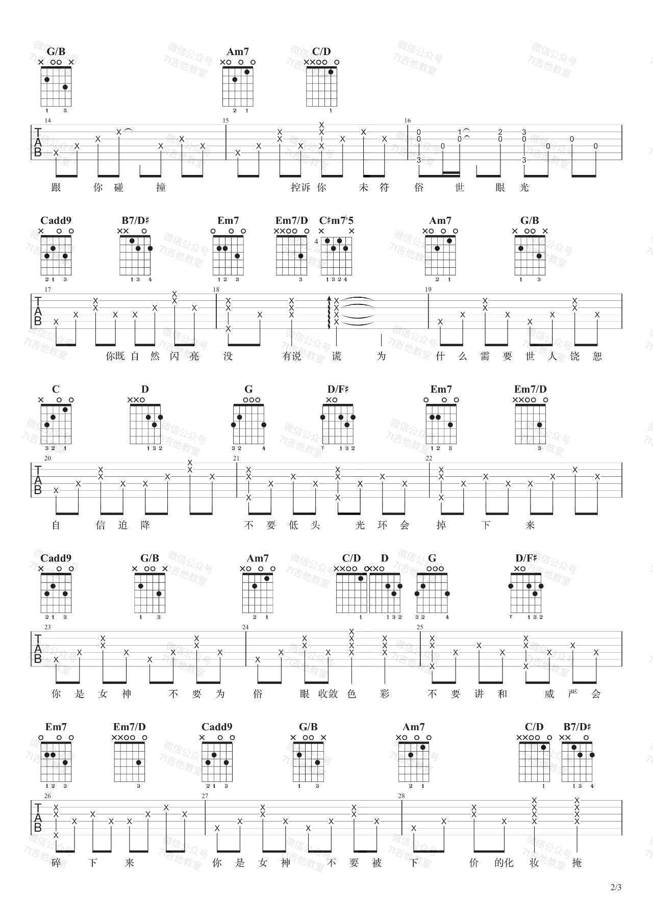 《郑欣宜《女神吉他谱》(G调)》内容来自于互联网,不能保证内容的准确性与完整性,仅供学习交流欣赏,请勿用于其它用途,内容版权归原作者及来源网站所有,如有侵犯到您的权益请来信告知,我们将及时删除。