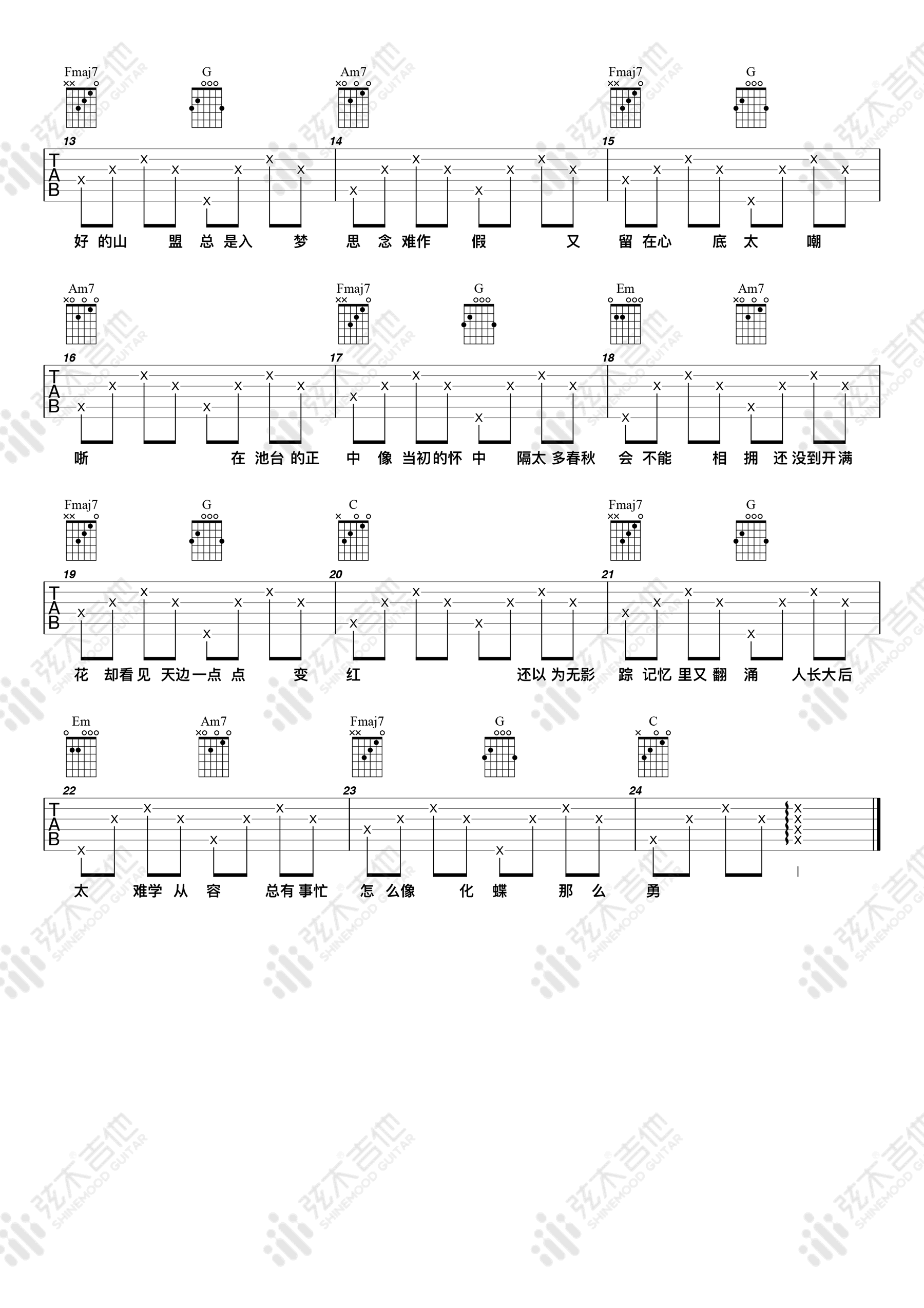 《一首网络古风歌曲,《沈园外吉他谱》(C调)》内容来自于互联网,不能保证内容的准确性与完整性,仅供学习交流欣赏,请勿用于其它用途,内容版权归原作者及来源网站所有,如有侵犯到您的权益请来信告知,我们将及时删除。