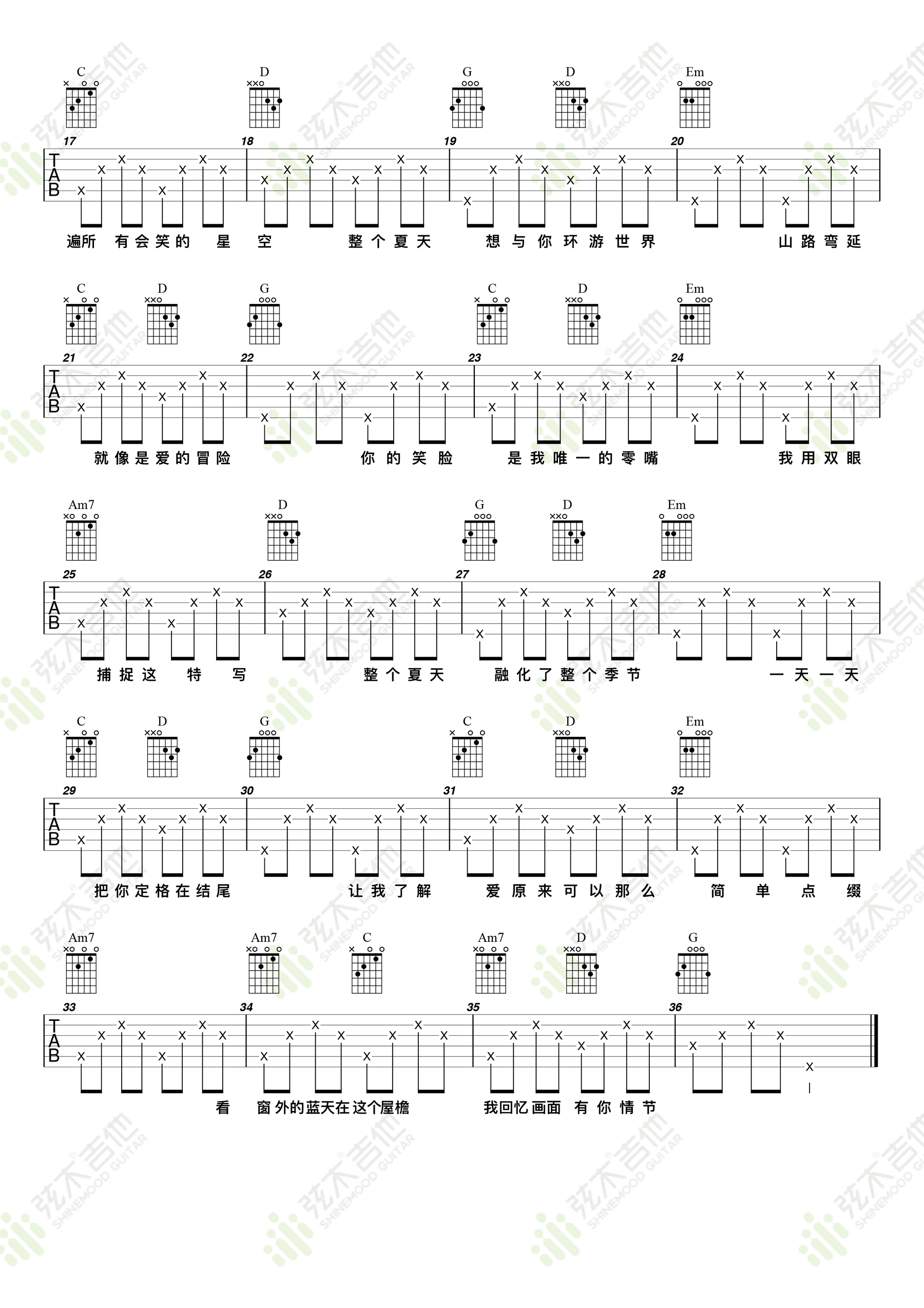《李玖哲《夏天吉他谱》(G调)》内容来自于互联网,不能保证内容的准确性与完整性,仅供学习交流欣赏,请勿用于其它用途,内容版权归原作者及来源网站所有,如有侵犯到您的权益请来信告知,我们将及时删除。