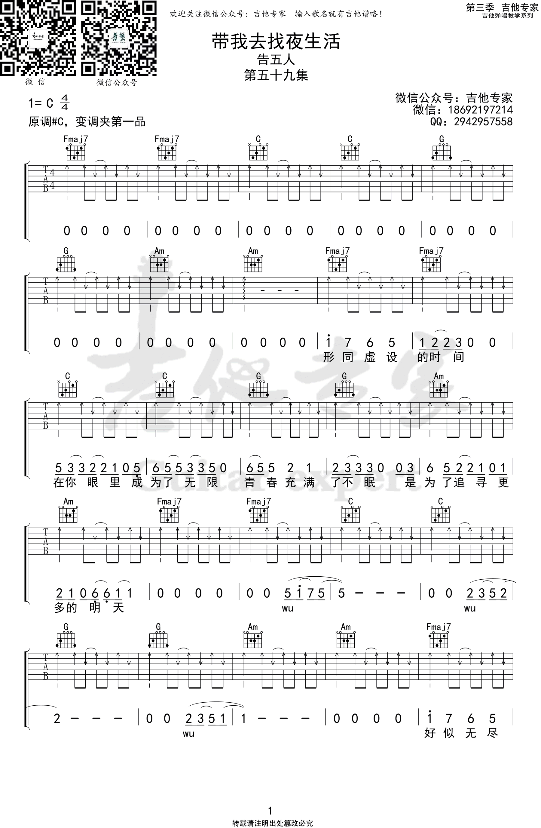 《告五人《带我去找夜生活吉他谱》(C调)》内容来自于互联网,不能保证内容的准确性与完整性,仅供学习交流欣赏,请勿用于其它用途,内容版权归原作者及来源网站所有,如有侵犯到您的权益请来信告知,我们将及时删除。