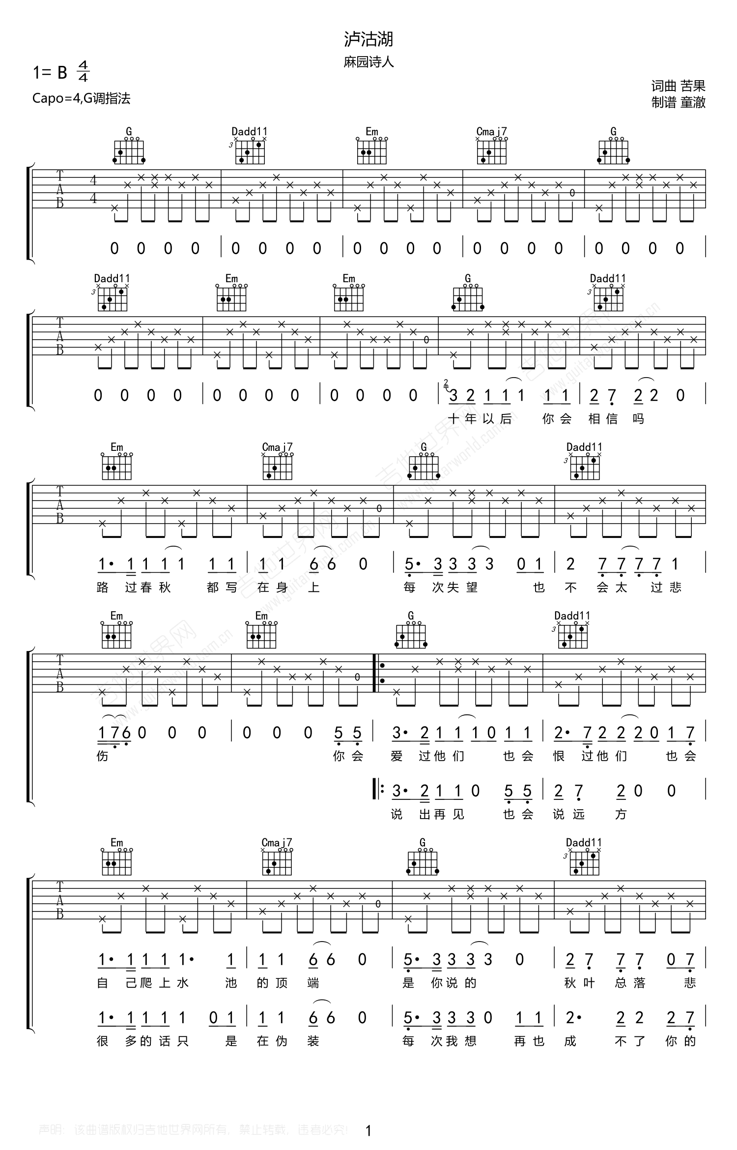 《麻园诗人《泸沽湖吉他谱》(G调)》内容来自于互联网,不能保证内容的准确性与完整性,仅供学习交流欣赏,请勿用于其它用途,内容版权归原作者及来源网站所有,如有侵犯到您的权益请来信告知,我们将及时删除。