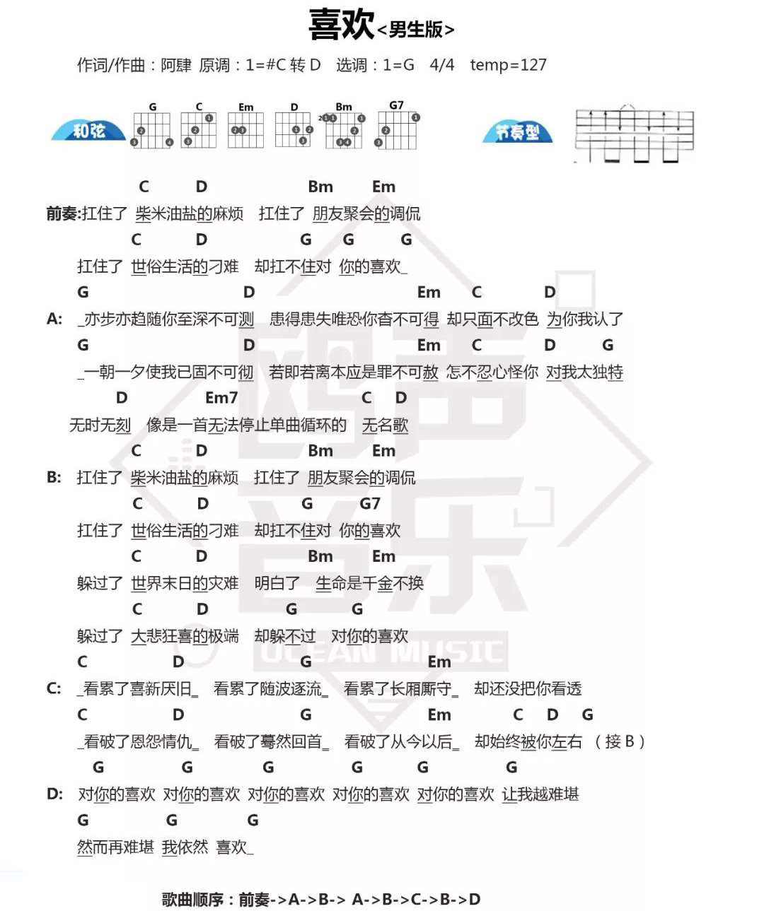 《阿肆《喜欢吉他谱》(G调)》内容来自于互联网,不能保证内容的准确性与完整性,仅供学习交流欣赏,请勿用于其它用途,内容版权归原作者及来源网站所有,如有侵犯到您的权益请来信告知,我们将及时删除。