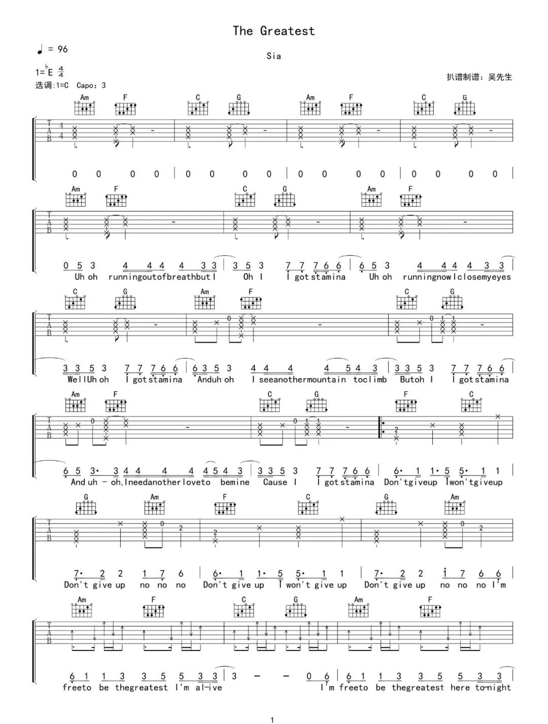 《《The Greatest吉他谱》(C调)》内容来自于互联网,不能保证内容的准确性与完整性,仅供学习交流欣赏,请勿用于其它用途,内容版权归原作者及来源网站所有,如有侵犯到您的权益请来信告知,我们将及时删除。