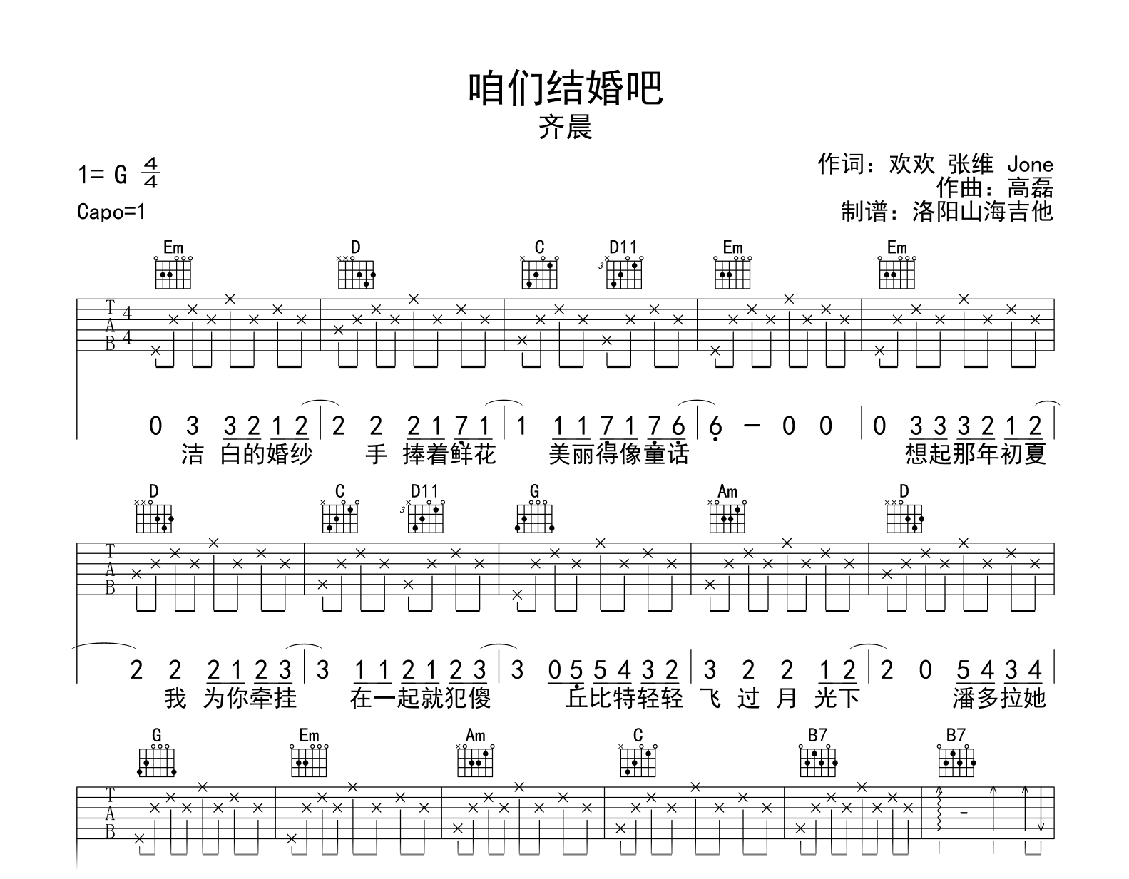 《齐晨《咱们结婚吧吉他谱》(G调)》内容来自于互联网,不能保证内容的准确性与完整性,仅供学习交流欣赏,请勿用于其它用途,内容版权归原作者及来源网站所有,如有侵犯到您的权益请来信告知,我们将及时删除。