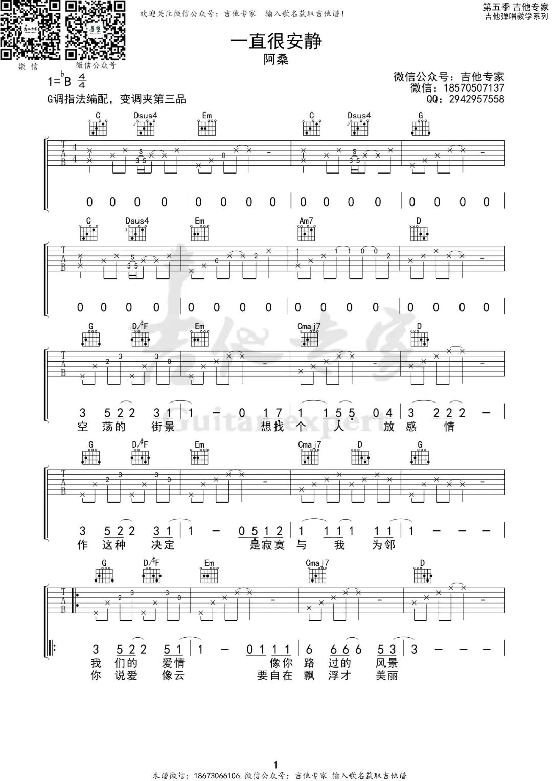 《阿桑《一直很安静吉他谱》(G调)》内容来自于互联网,不能保证内容的准确性与完整性,仅供学习交流欣赏,请勿用于其它用途,内容版权归原作者及来源网站所有,如有侵犯到您的权益请来信告知,我们将及时删除。