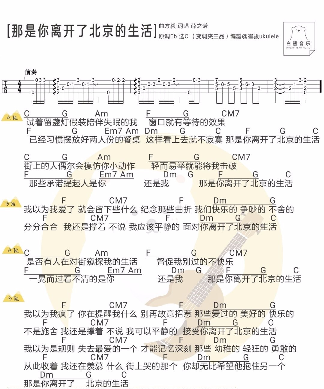 《薛之谦《那是你离开了北京的生活吉他谱》(C调)》内容来自于互联网,不能保证内容的准确性与完整性,仅供学习交流欣赏,请勿用于其它用途,内容版权归原作者及来源网站所有,如有侵犯到您的权益请来信告知,我们将及时删除。