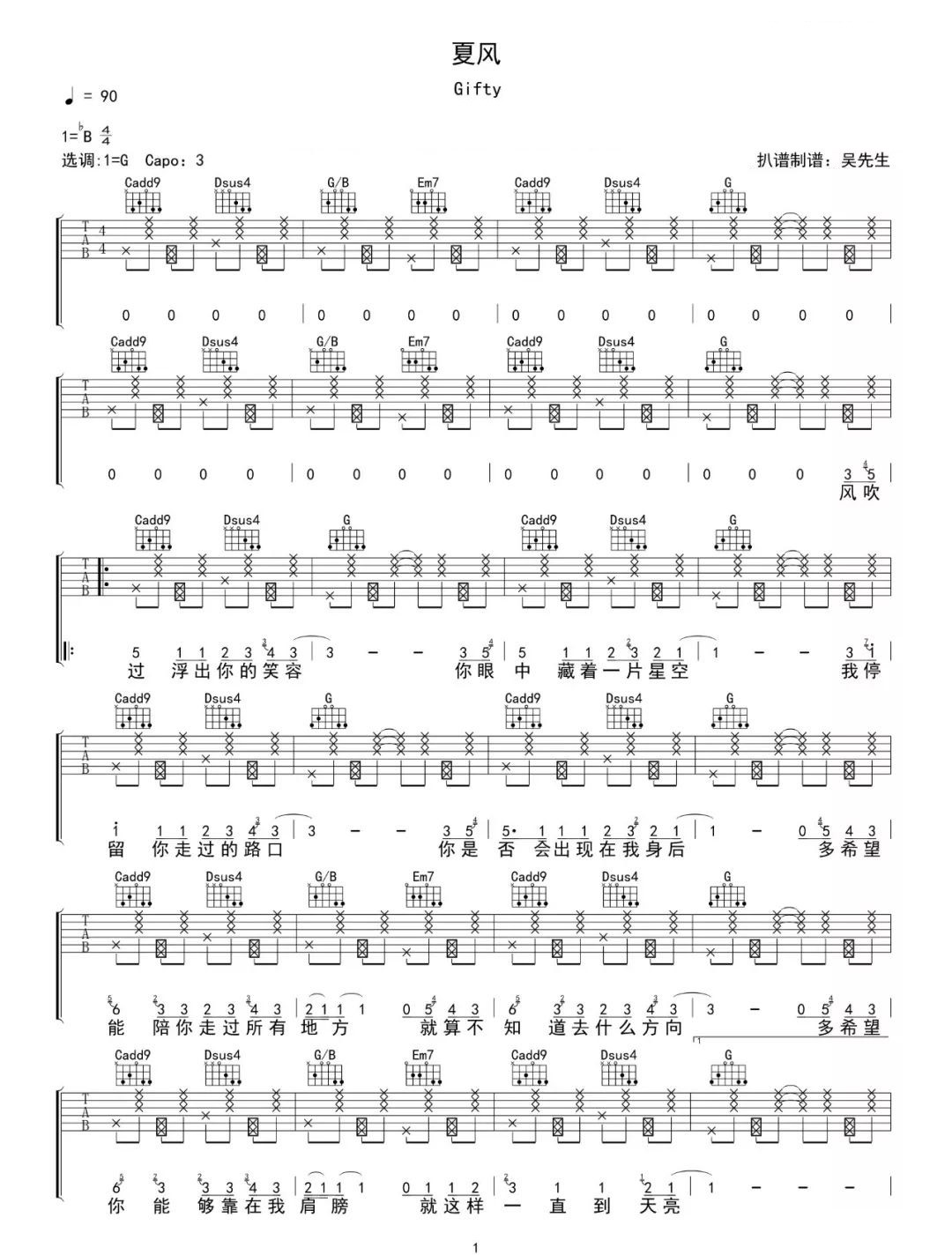 《Gifty《夏风吉他谱》(C调)》内容来自于互联网,不能保证内容的准确性与完整性,仅供学习交流欣赏,请勿用于其它用途,内容版权归原作者及来源网站所有,如有侵犯到您的权益请来信告知,我们将及时删除。