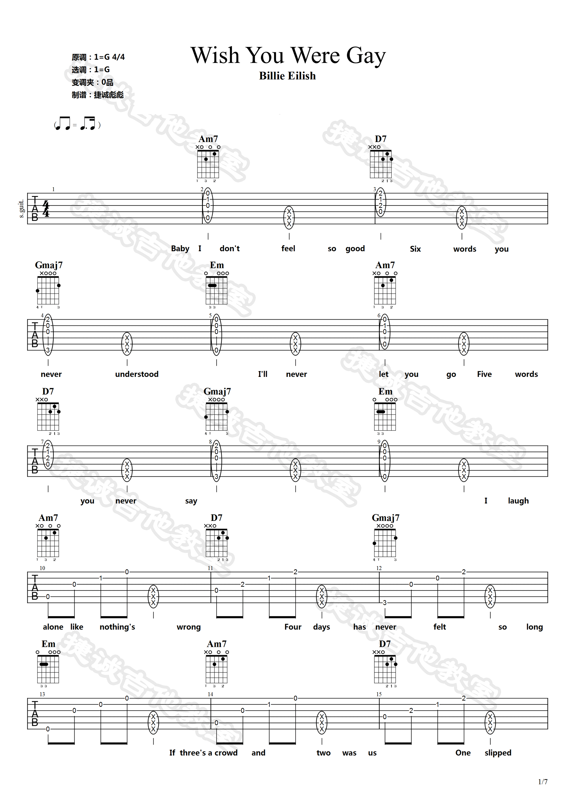 Billie Eilish演唱的《Wish You Were Gay》是一首特别的情歌,歌曲描述了Billie向心仪的男生表白未果后,内心的怪异情感。这份吉他谱以G调为基准,来源于捷诚吉他教室的制谱,根据原版进行了编配。谱子共7张,但整体来说相对简单,和弦按起