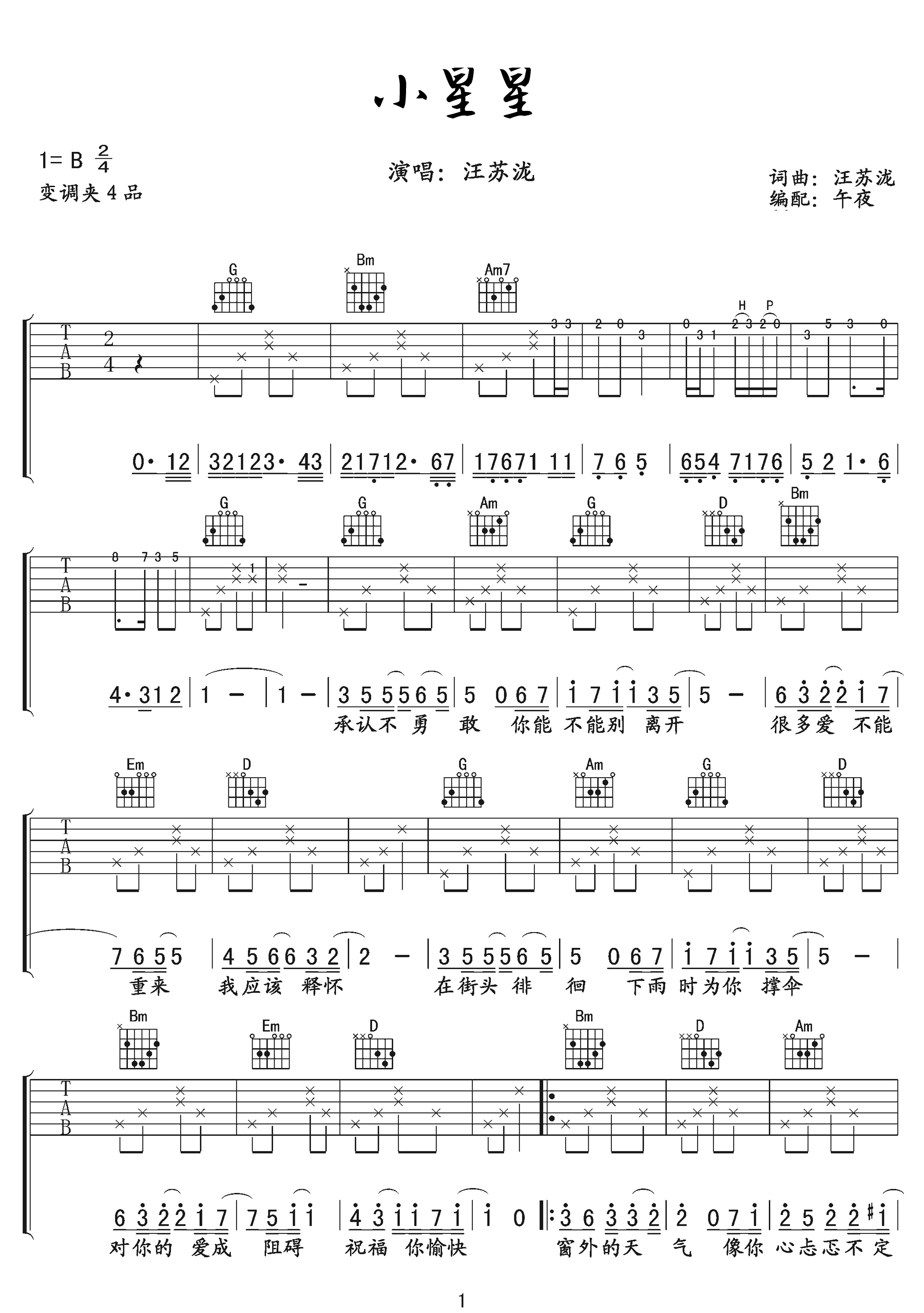 汪苏泷创作演唱的《小星星》是一首扣人心弦的歌曲,勾起了许多人对高中时代的美好回忆。歌曲以甜美的旋律和温暖的歌词为人们带来愉悦的情感体验,成为了许多表白的首选曲目。这份吉他谱采自午夜扒谱制谱,以G调编排,相对于原调B调进行了调整。值得一提的是,前奏、间奏以及尾奏