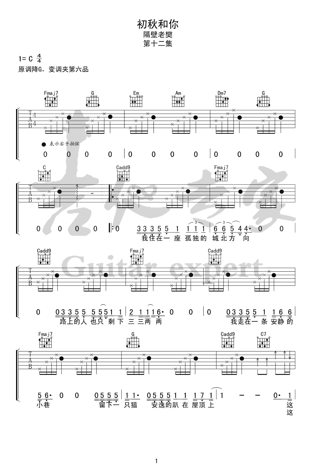 《隔壁老樊《初秋和你吉他谱》(C调)》内容来自于互联网,不能保证内容的准确性与完整性,仅供学习交流欣赏,请勿用于其它用途,内容版权归原作者及来源网站所有,如有侵犯到您的权益请来信告知,我们将及时删除。