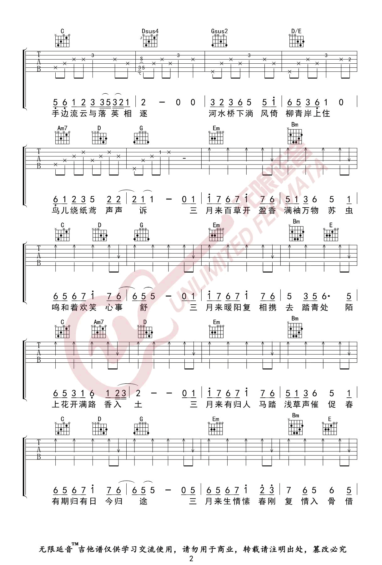 《司南《春三月吉他谱》(C调)》内容来自于互联网,不能保证内容的准确性与完整性,仅供学习交流欣赏,请勿用于其它用途,内容版权归原作者及来源网站所有,如有侵犯到您的权益请来信告知,我们将及时删除。