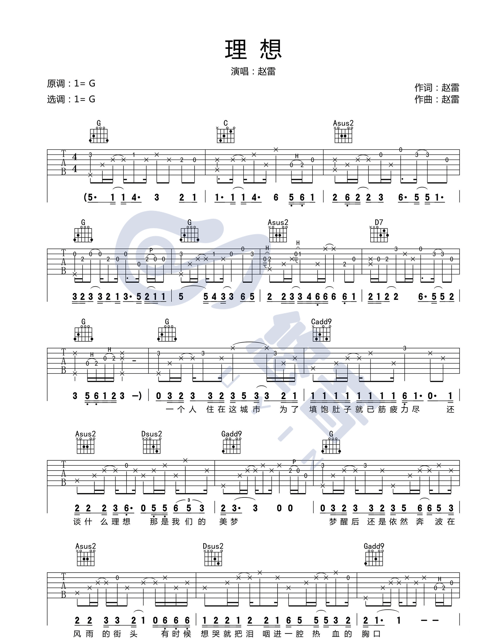 《赵雷《理想吉他谱》(G调)》内容来自于互联网,不能保证内容的准确性与完整性,仅供学习交流欣赏,请勿用于其它用途,内容版权归原作者及来源网站所有,如有侵犯到您的权益请来信告知,我们将及时删除。