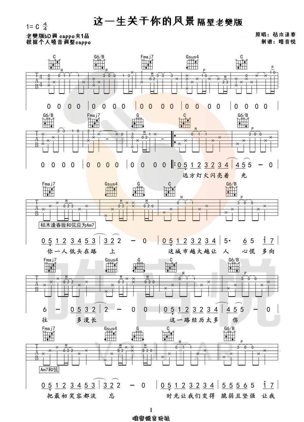 《隔壁老樊《这一生关于你的风景吉他谱》(C调)》内容来自于互联网,不能保证内容的准确性与完整性,仅供学习交流欣赏,请勿用于其它用途,内容版权归原作者及来源网站所有,如有侵犯到您的权益请来信告知,我们将及时删除。