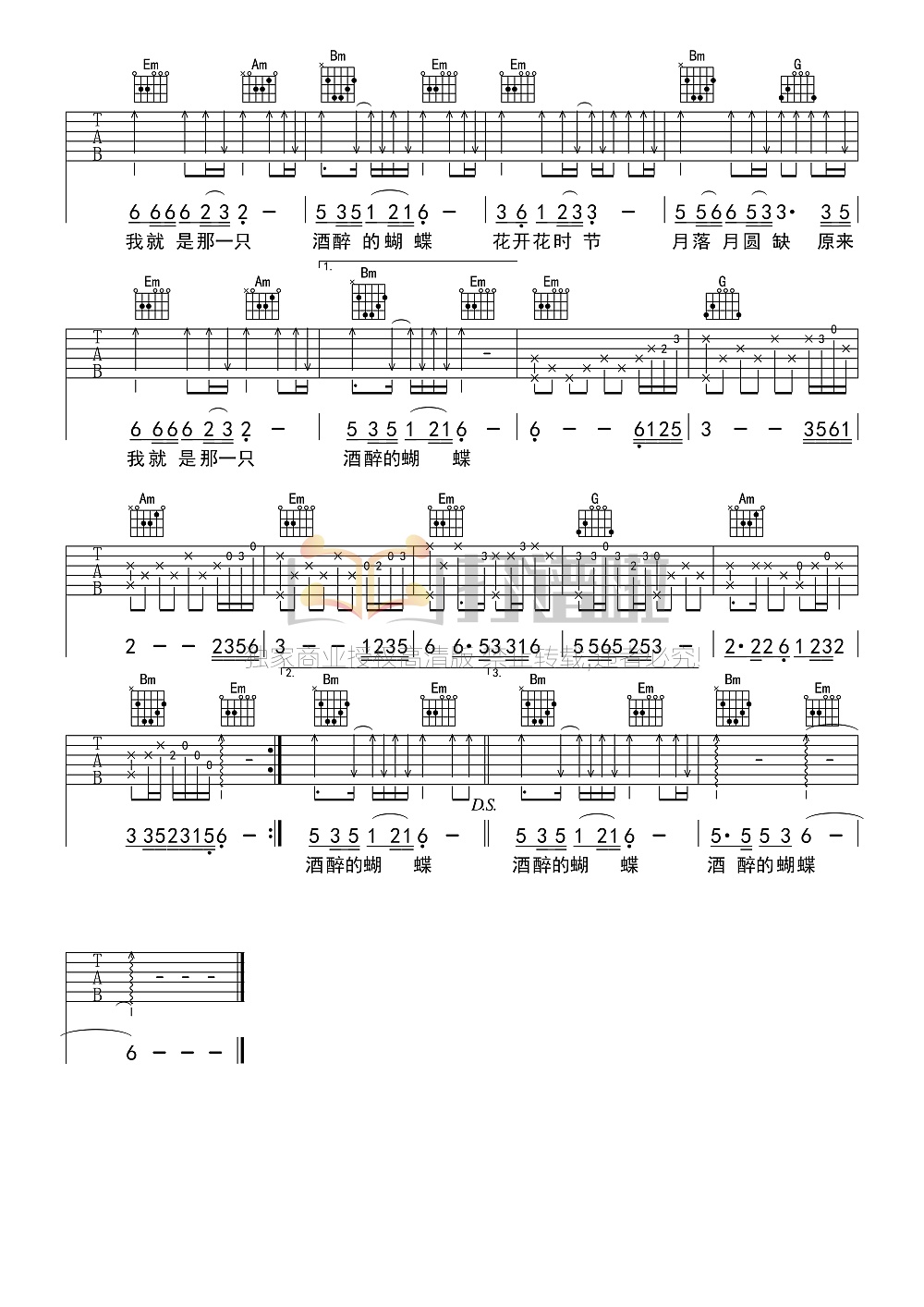 《崔伟立《酒醉的蝴蝶吉他谱》(G调)》内容来自于互联网,不能保证内容的准确性与完整性,仅供学习交流欣赏,请勿用于其它用途,内容版权归原作者及来源网站所有,如有侵犯到您的权益请来信告知,我们将及时删除。