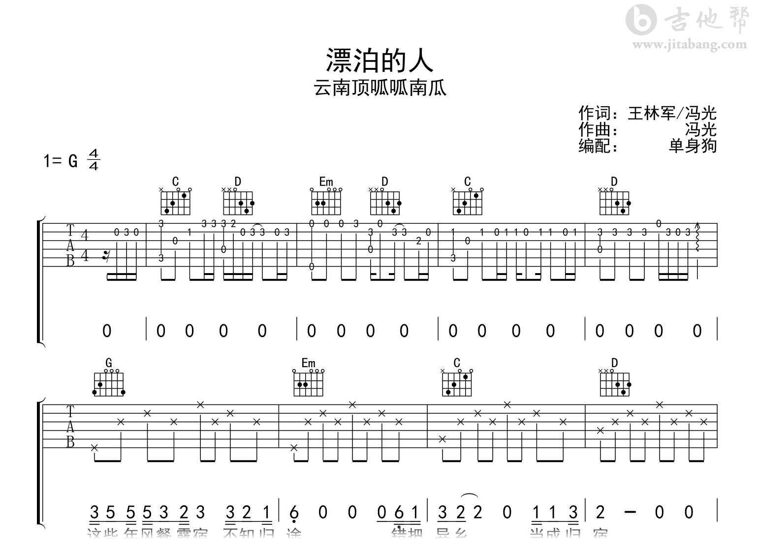 云南顶呱呱《漂泊的人吉他谱》(G调)