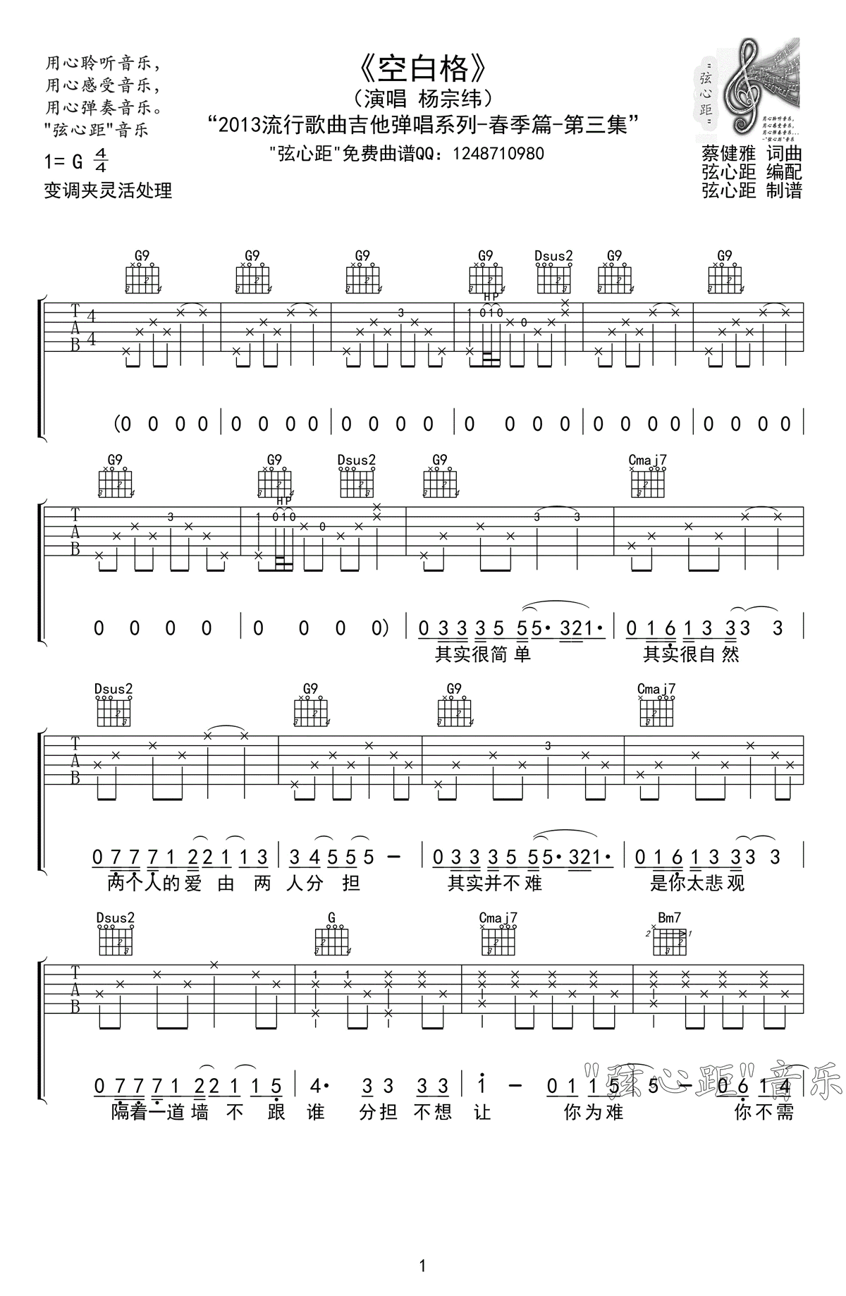 《蔡健雅《空白格吉他谱》(C调)》内容来自于互联网,不能保证内容的准确性与完整性,仅供学习交流欣赏,请勿用于其它用途,内容版权归原作者及来源网站所有,如有侵犯到您的权益请来信告知,我们将及时删除。