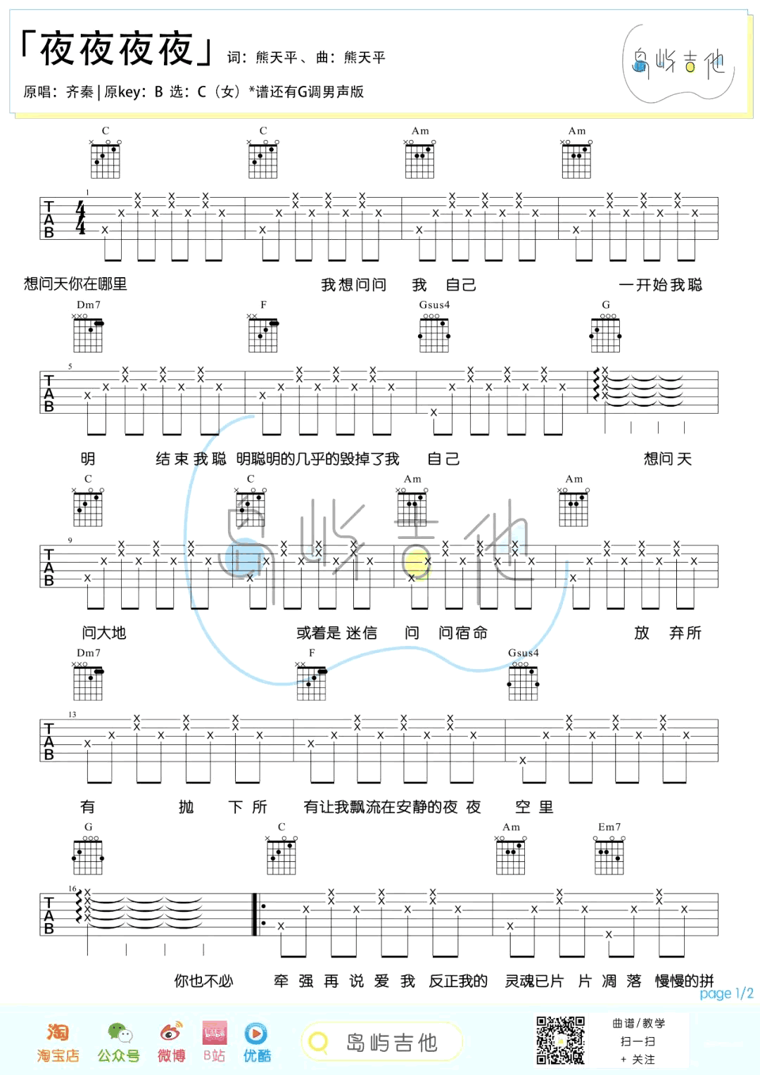 《夜夜夜夜》是齐秦原创并演唱的经典代表作,由熊天平谱写词曲。我们提供了原调B的吉他弹唱谱,并特别为琴友们准备了男生版(G调)和女生版(C调)两个编配版本,共有四张图片,包含六线谱。无论是喜欢男声还是女声演绎,都可以找到适合自己的版本。这首歌曲充满了浓郁的夜晚情