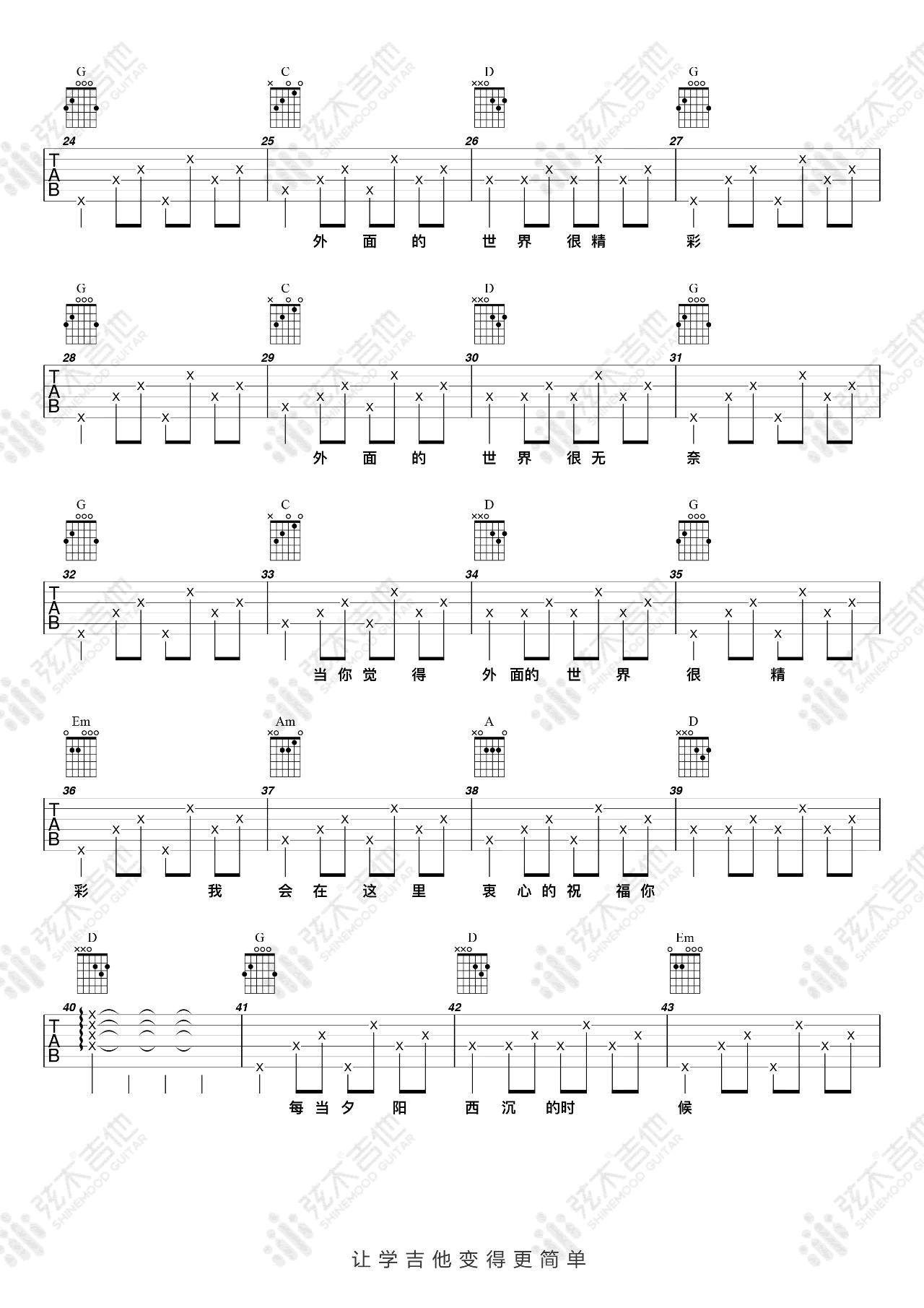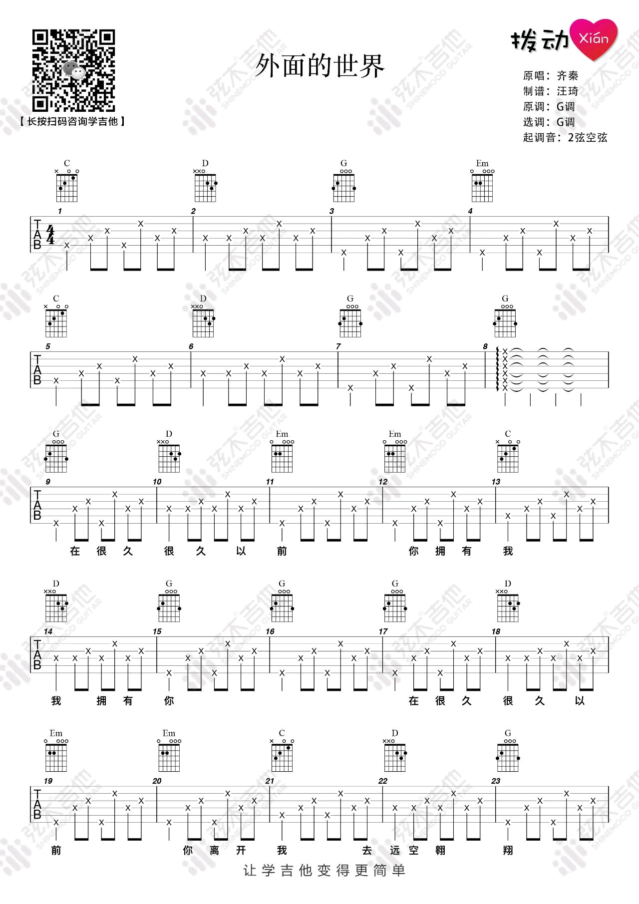 《齐秦《外面的世界吉他谱》(G调)》内容来自于互联网,不能保证内容的准确性与完整性,仅供学习交流欣赏,请勿用于其它用途,内容版权归原作者及来源网站所有,如有侵犯到您的权益请来信告知,我们将及时删除。