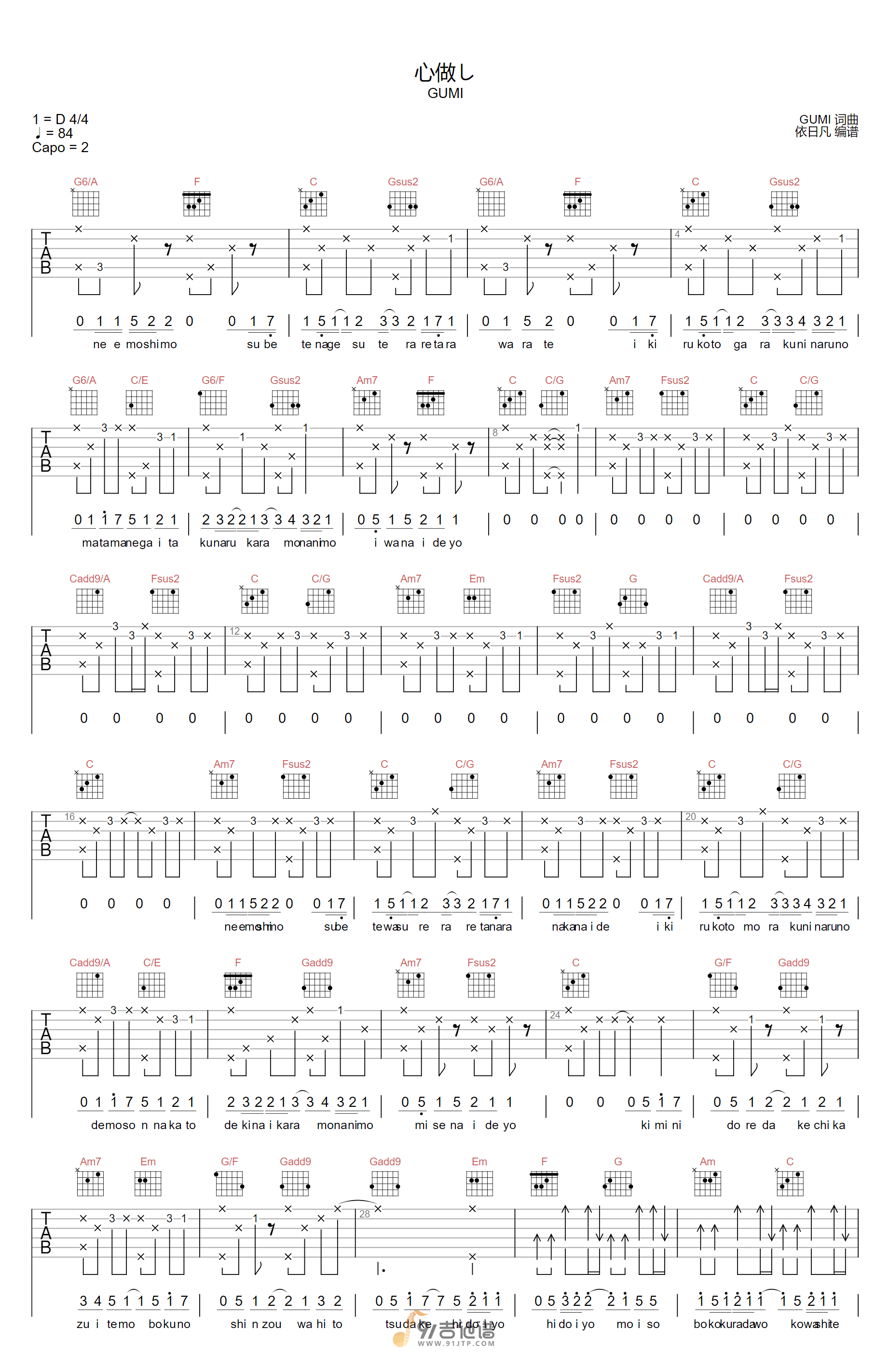 "心做し"是一首由双笙演唱的歌曲,曲谱以C调指法编配而成,原调为D调。歌曲采用4/4拍的节奏,演唱时可使用变调夹2品回到原调,也可根据个人嗓音选择合适的调式。这首歌曲的曲谱由依日凡编配制作。