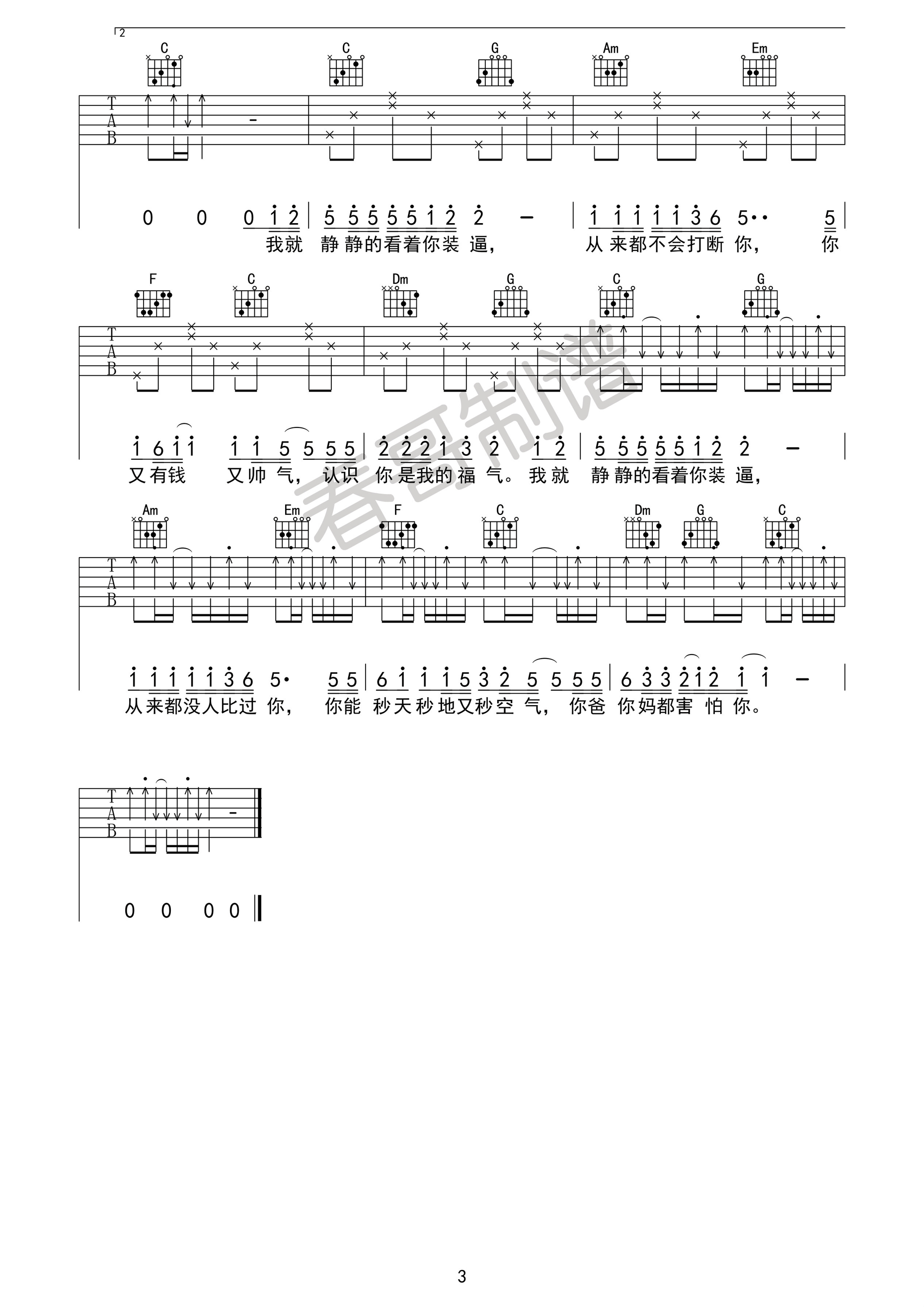 《花粥《静静的看着你装逼吉他谱》(C调)》内容来自于互联网,不能保证内容的准确性与完整性,仅供学习交流欣赏,请勿用于其它用途,内容版权归原作者及来源网站所有,如有侵犯到您的权益请来信告知,我们将及时删除。