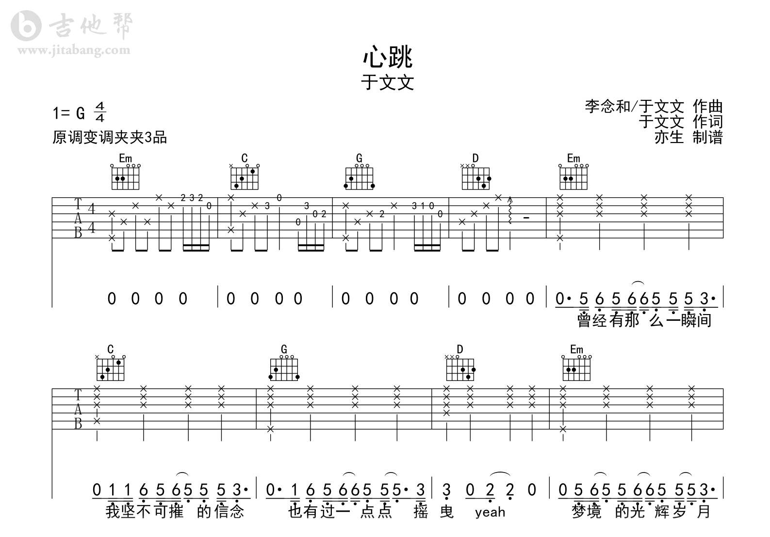 《文文《心跳吉他谱》(G调)》内容来自于互联网,不能保证内容的准确性与完整性,仅供学习交流欣赏,请勿用于其它用途,内容版权归原作者及来源网站所有,如有侵犯到您的权益请来信告知,我们将及时删除。