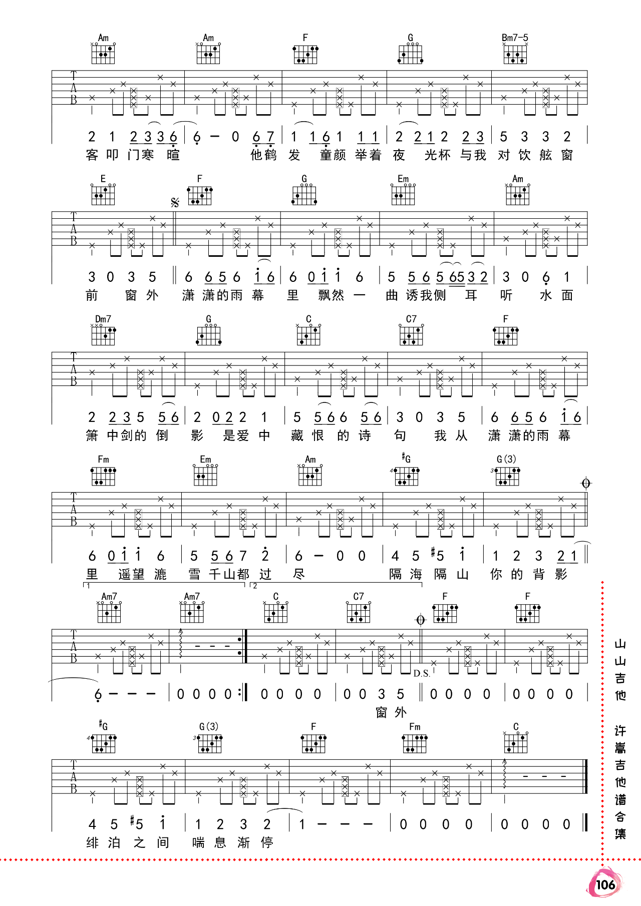 《雨幕》是由音乐人许嵩创作并演唱的《新天龙八部》游戏主题曲。这首中国风歌曲采用了F调的原曲,使用C调的指法,配以夹五品的变调夹。山山吉他编配的两张图片谱将曲调完美呈现。这首歌曲充满诗情画意,旋律优美动人,歌词更是精妙绝伦,令人陶醉其中。体验这首歌曲,仿佛漫步在