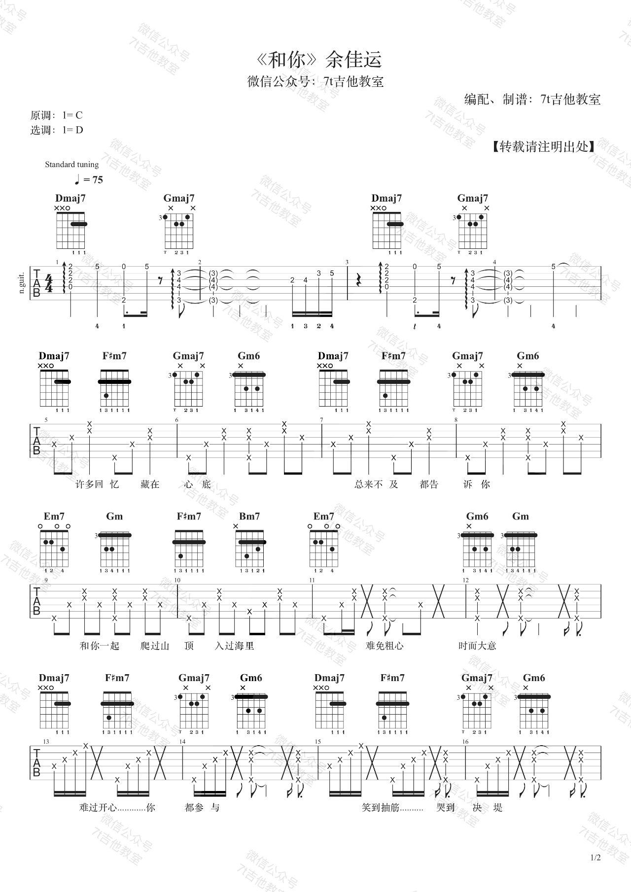 《余佳运《和你吉他谱》(D调)》内容来自于互联网,不能保证内容的准确性与完整性,仅供学习交流欣赏,请勿用于其它用途,内容版权归原作者及来源网站所有,如有侵犯到您的权益请来信告知,我们将及时删除。