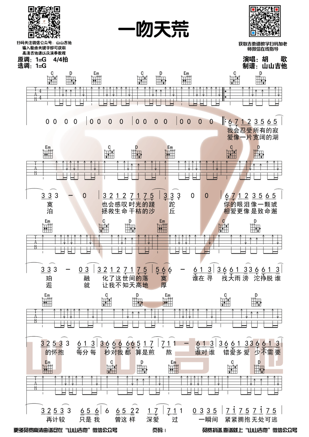 《大壮《一吻天荒吉他谱》(G调)》内容来自于互联网,不能保证内容的准确性与完整性,仅供学习交流欣赏,请勿用于其它用途,内容版权归原作者及来源网站所有,如有侵犯到您的权益请来信告知,我们将及时删除。