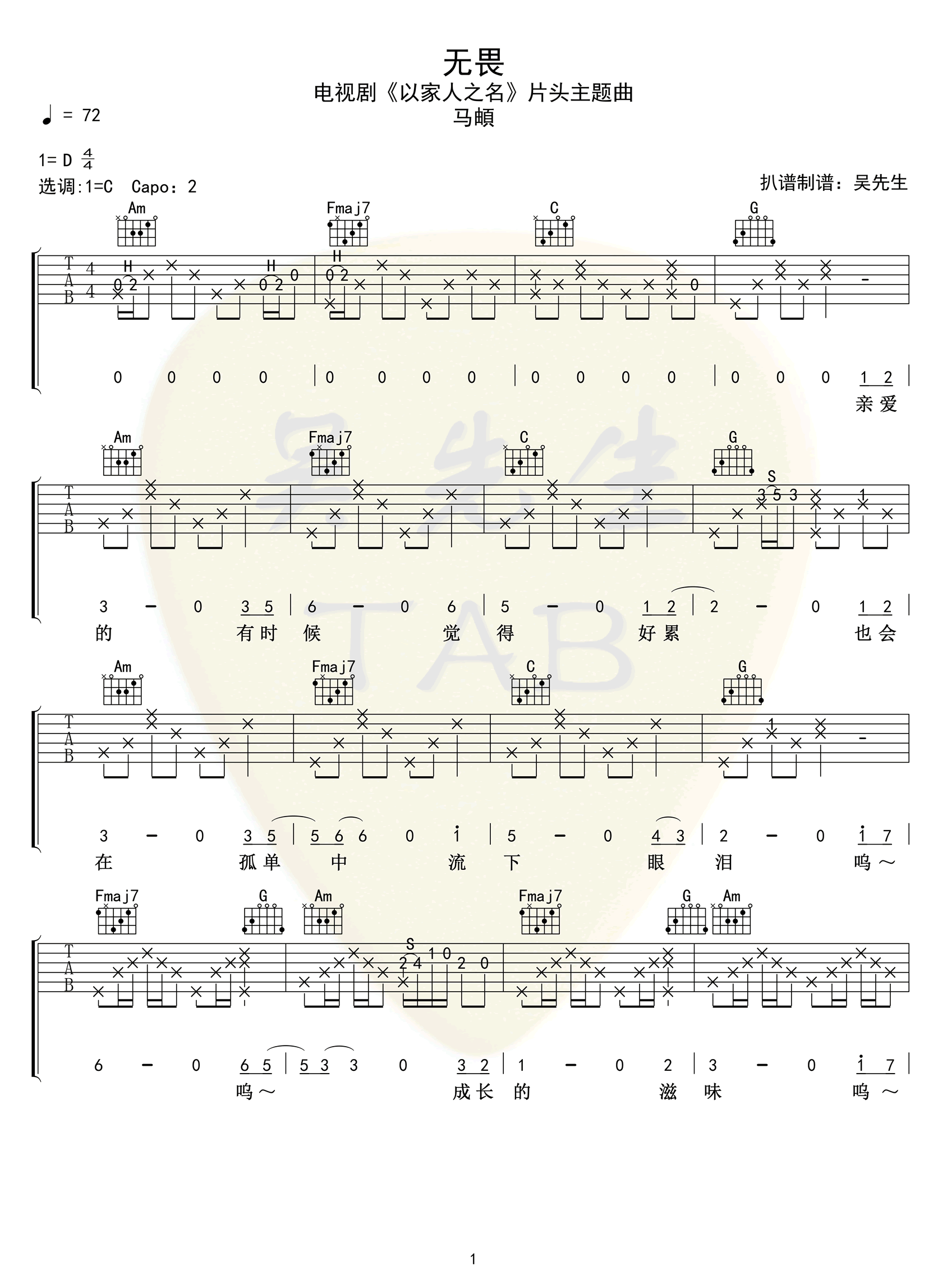 《无畏》是马頔演唱的一首歌曲,同时也是电视剧《以家人之名》的片头曲。你可以在高清图片谱中找到这首歌的吉他谱,以C调原版六线谱的形式呈现。这首歌曲备受欢迎,歌词充满深情,情感真挚,是近期热播剧的一部分,激发了观众的共鸣。