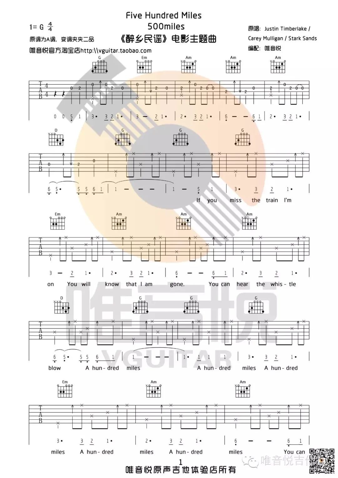 《500miles》是一首经典的美国民谣歌曲,深受人们喜爱,多年来被无数人翻唱,并成为许多影视作品的原声带。近期,欧阳娜娜在一档综艺节目中演唱了这首歌曲,引起了众多网友的热议与好评。这份吉他谱由唯音悦编制,原调为A调,但采用G调指法演奏,只需使用变调夹夹在第二