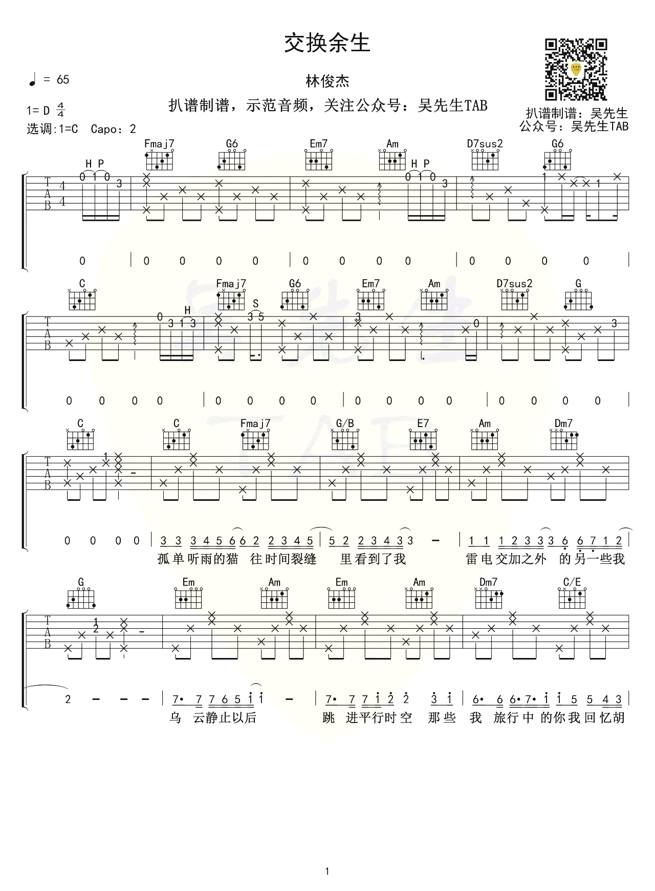 《林俊杰《交换余生吉他谱》(C调)》内容来自于互联网,不能保证内容的准确性与完整性,仅供学习交流欣赏,请勿用于其它用途,内容版权归原作者及来源网站所有,如有侵犯到您的权益请来信告知,我们将及时删除。